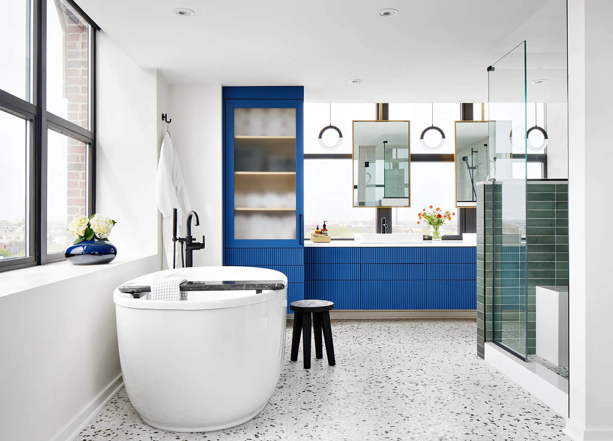 Contemporary primary bathroom with freestanding tub, blue cabinetry, terrazzo floor, glass shower, and large windows. Modern design with bold elements.