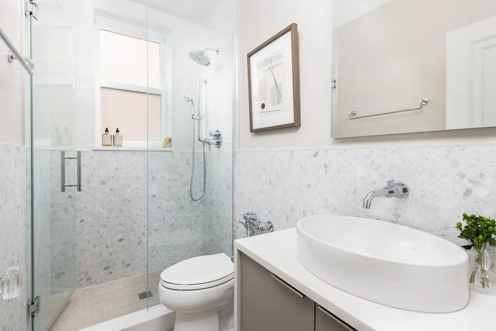 Minimalist bathroom with glass shower doors, sleek chrome fixtures, large window, terrazzo wall cladding, and abstract wall art.