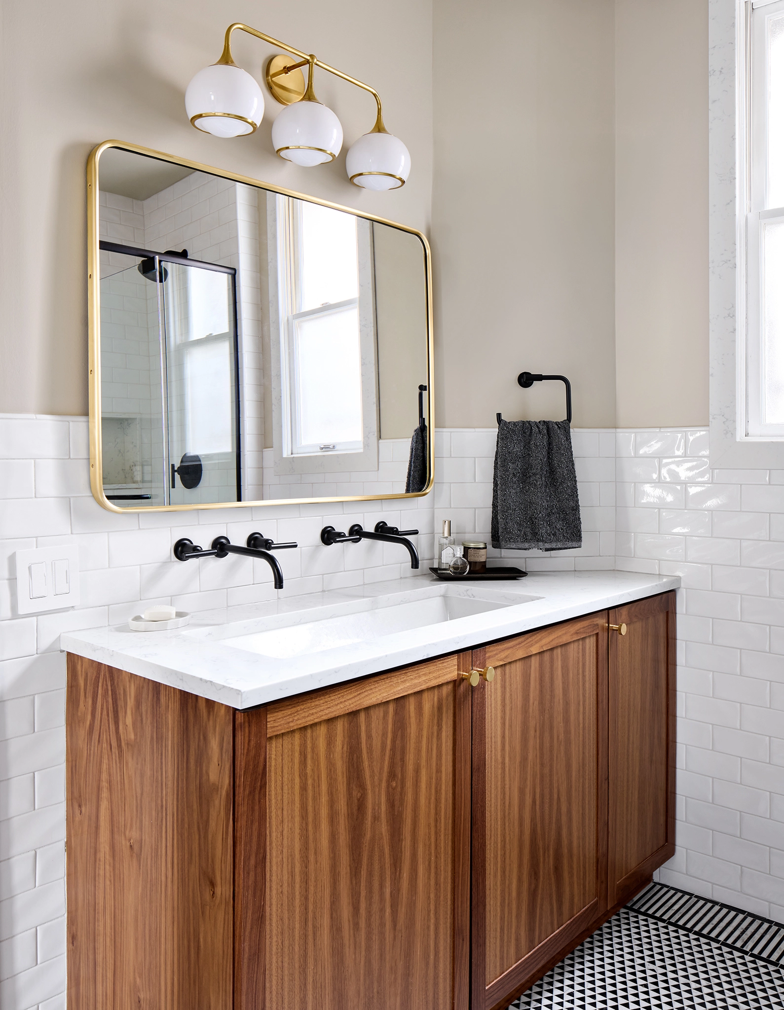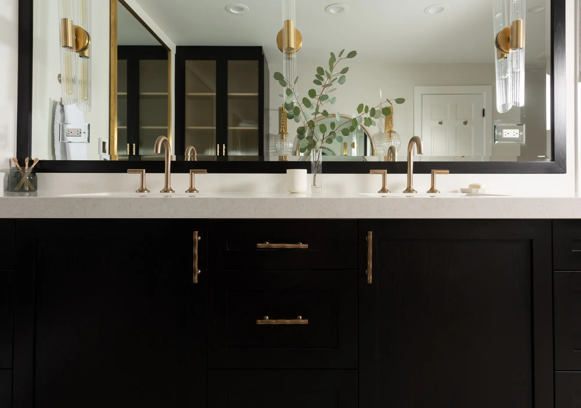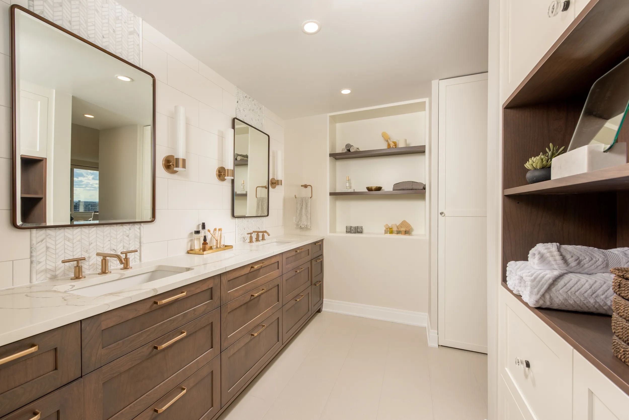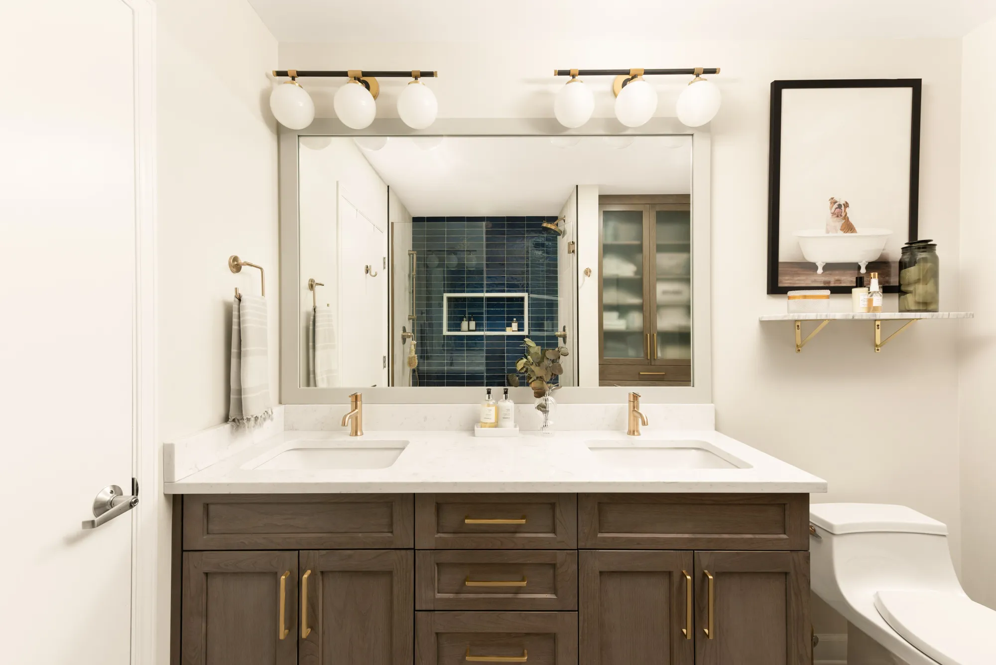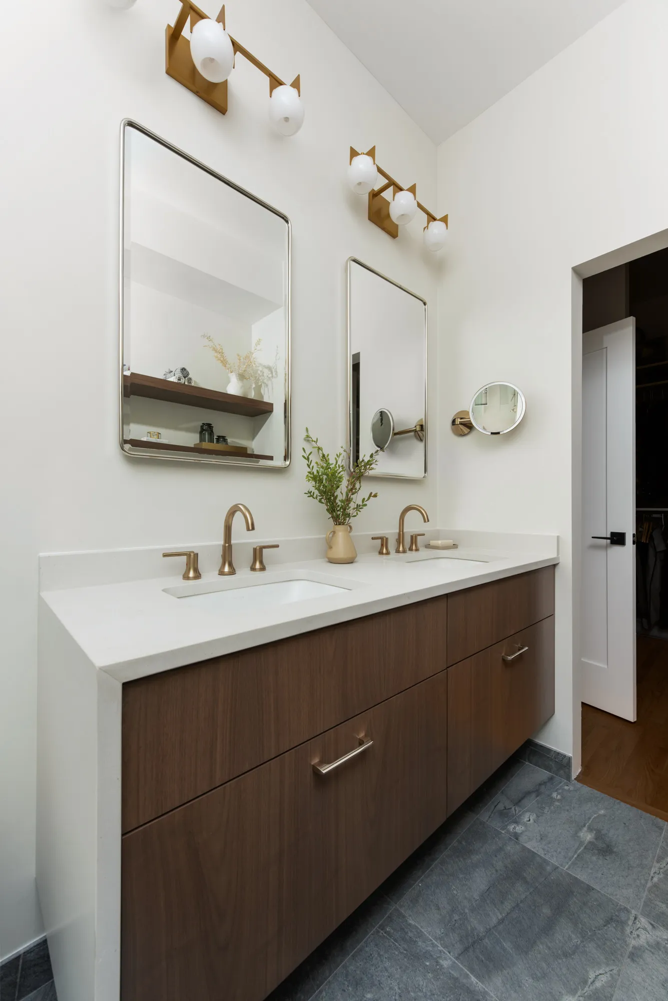 Transitional bathroom with dual sinks, elegant wood cabinetry, and sleek brass fixtures. Features a large mirror and modern lighting accents.