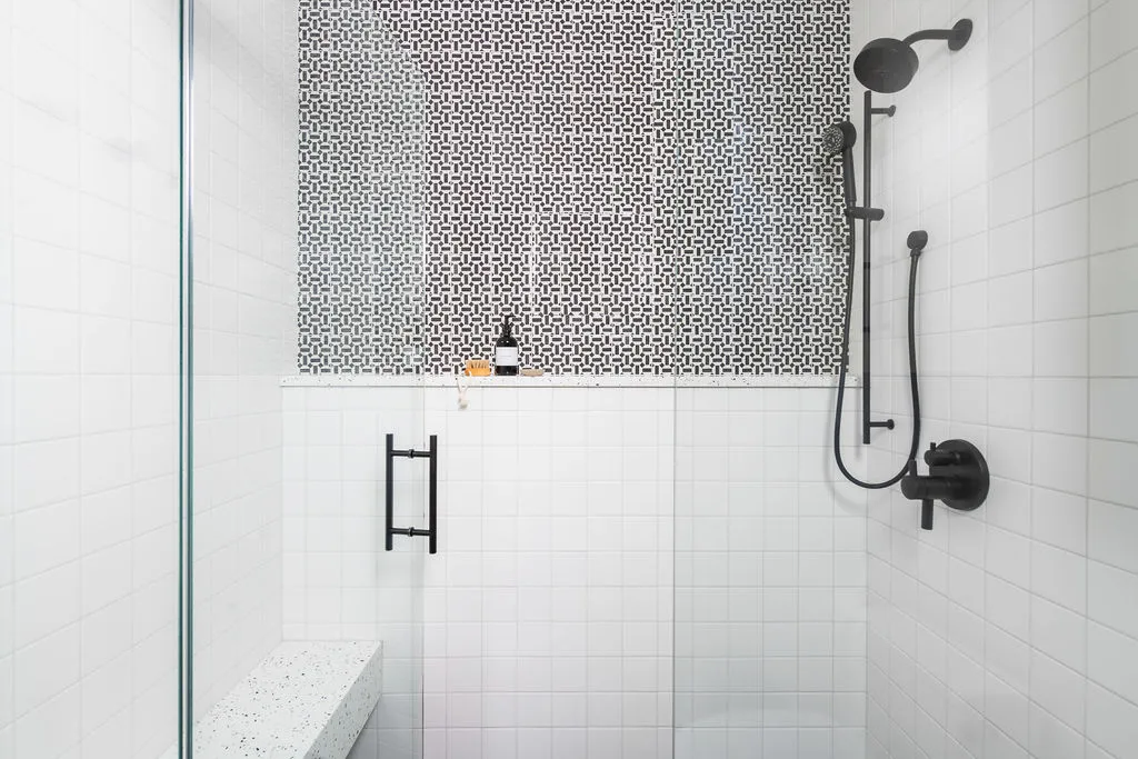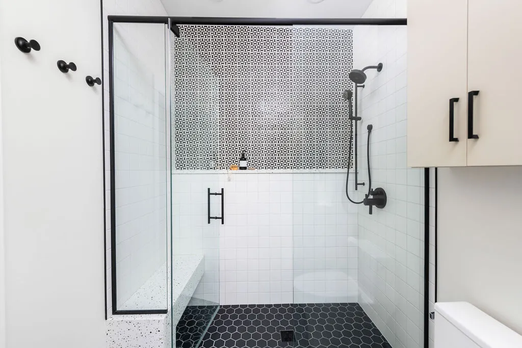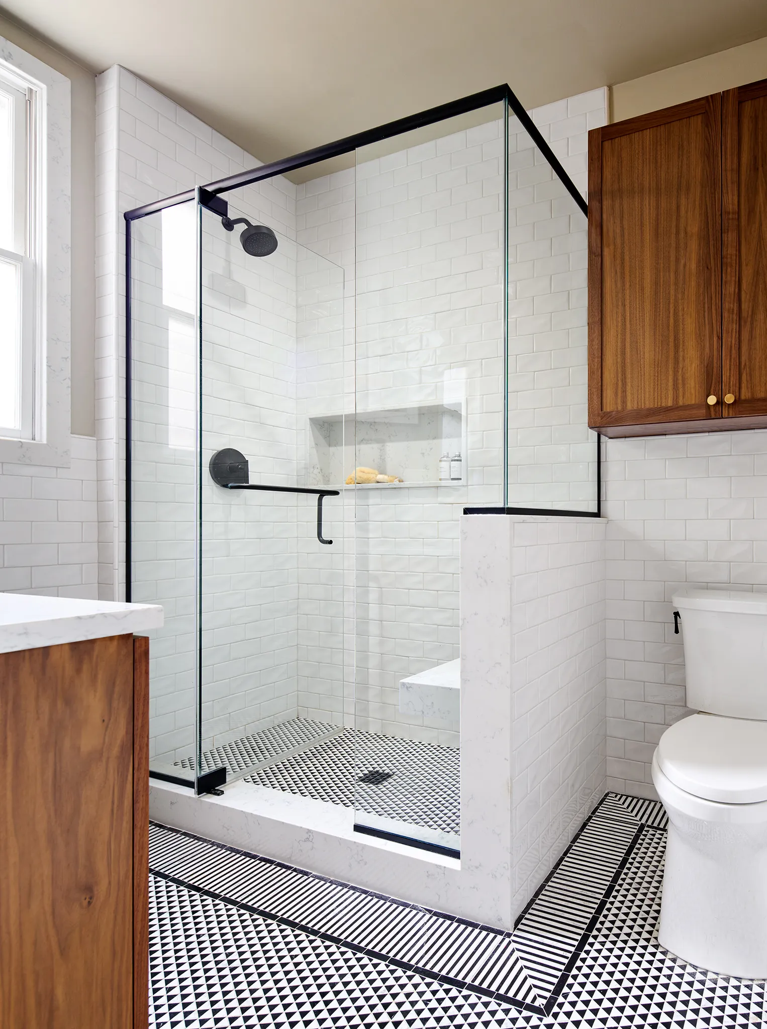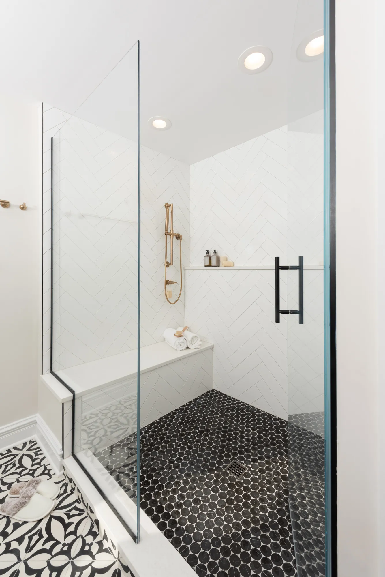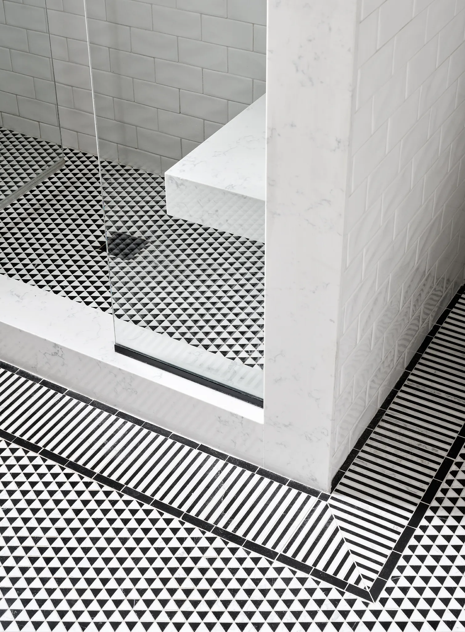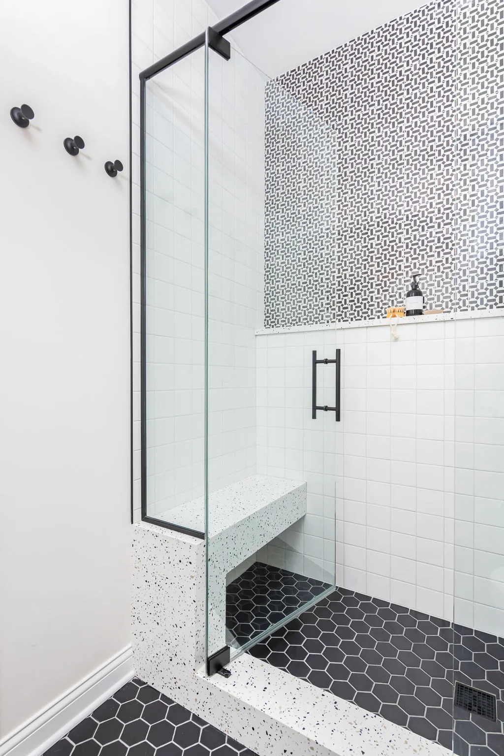 Contemporary primary bathroom with geometric black-and-white tiles, sleek glass shower enclosure, and minimalist bench for modern elegance.