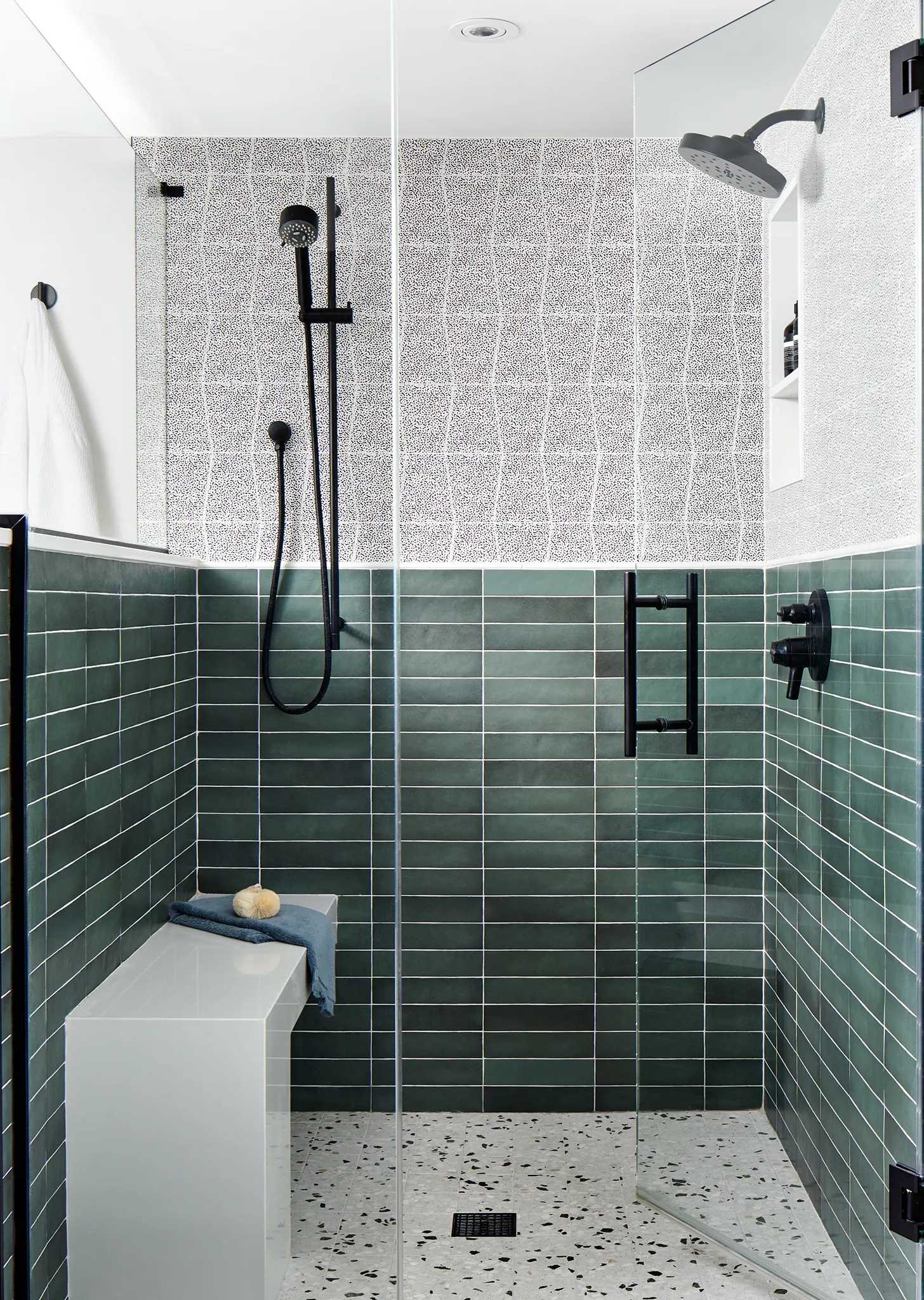 Contemporary primary bathroom with sleek green tiles, black fixtures, and terrazzo flooring. Textured wall adds modern elegance and architectural depth.