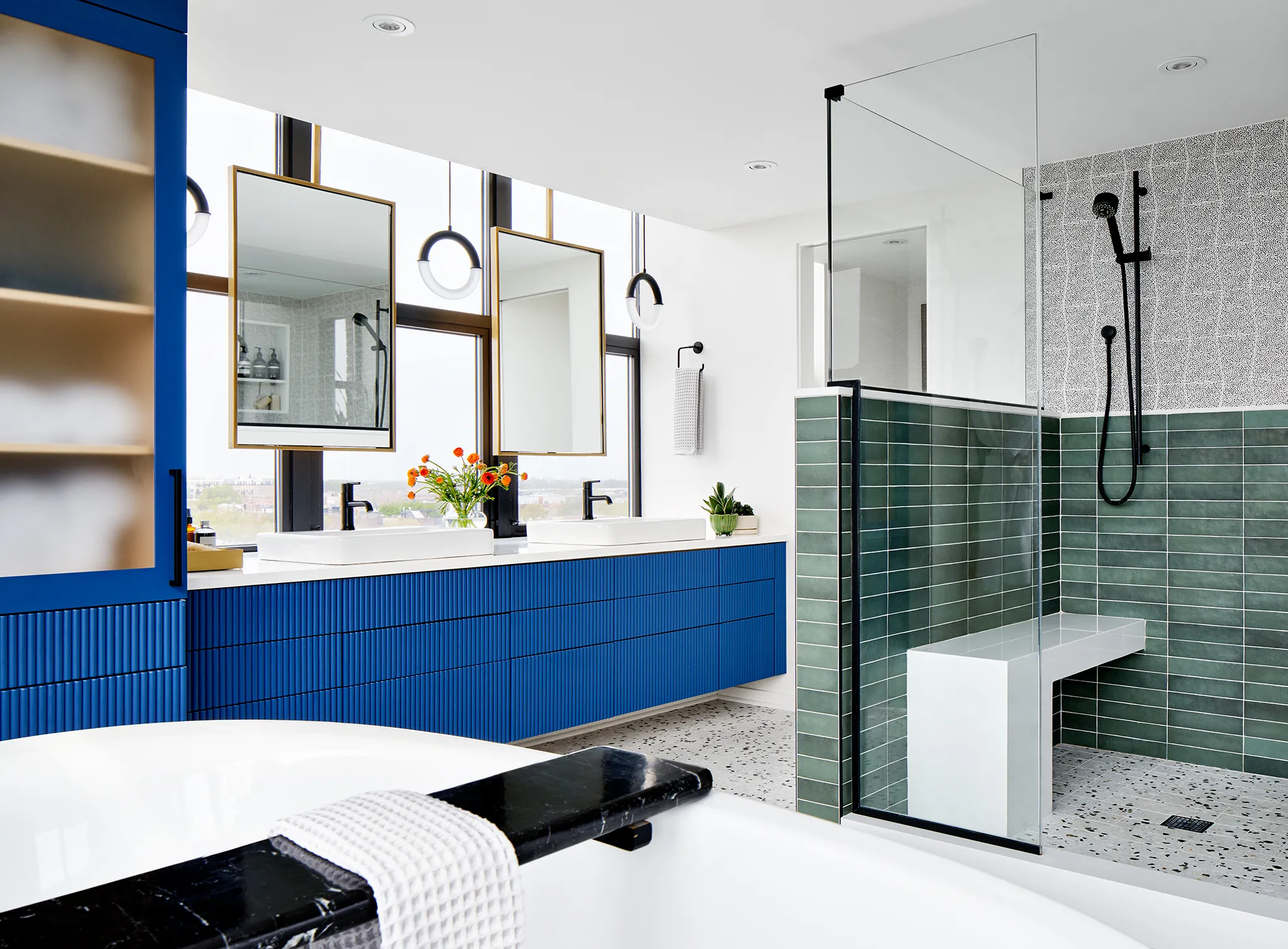 Contemporary primary bathroom features bold blue cabinetry, sleek mirrors, glass shower with green tiles, and modern fixtures for a stylish design.