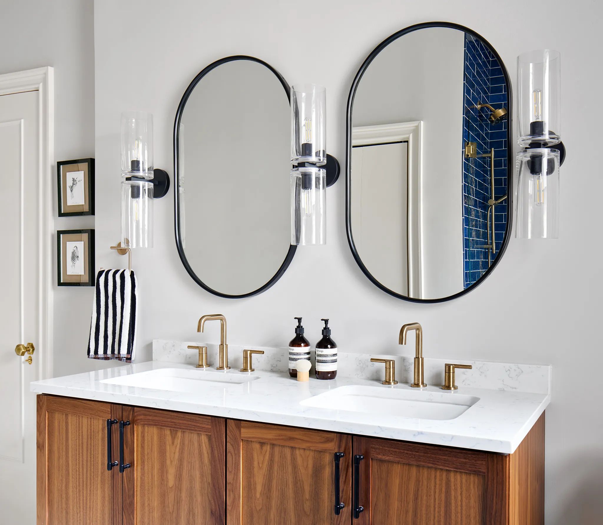 Mid-century modern guest bathroom with oval mirrors, sleek brass fixtures, and walnut cabinets. Stylish glass sconces provide elegant illumination.