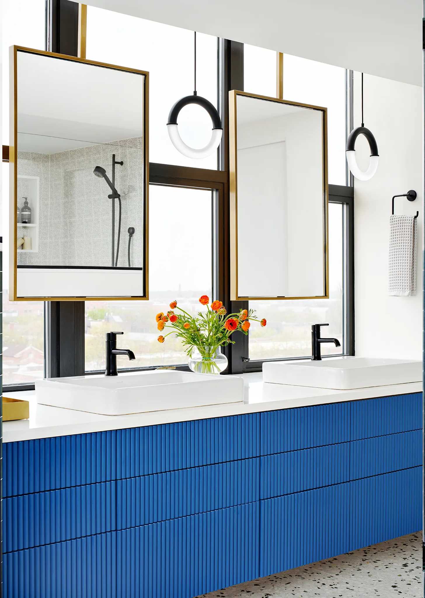 Contemporary primary bathroom featuring bold blue vanity, dual mirrors, sleek black fixtures, circular pendant lights, and terrazzo flooring.