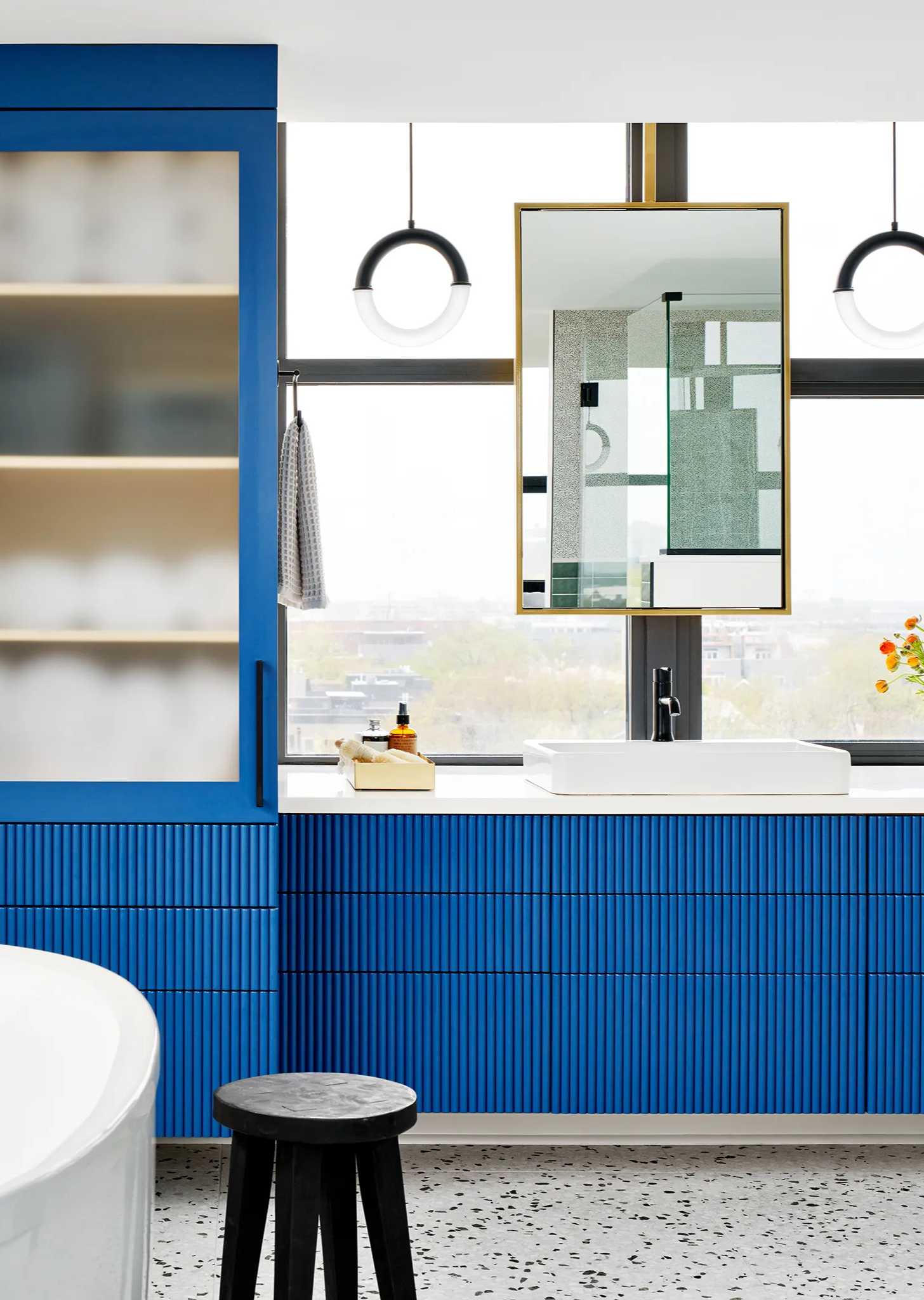 Contemporary primary bathroom featuring a bold blue vanity, terrazzo flooring, sleek fixtures, large mirror, and modern lighting accents.