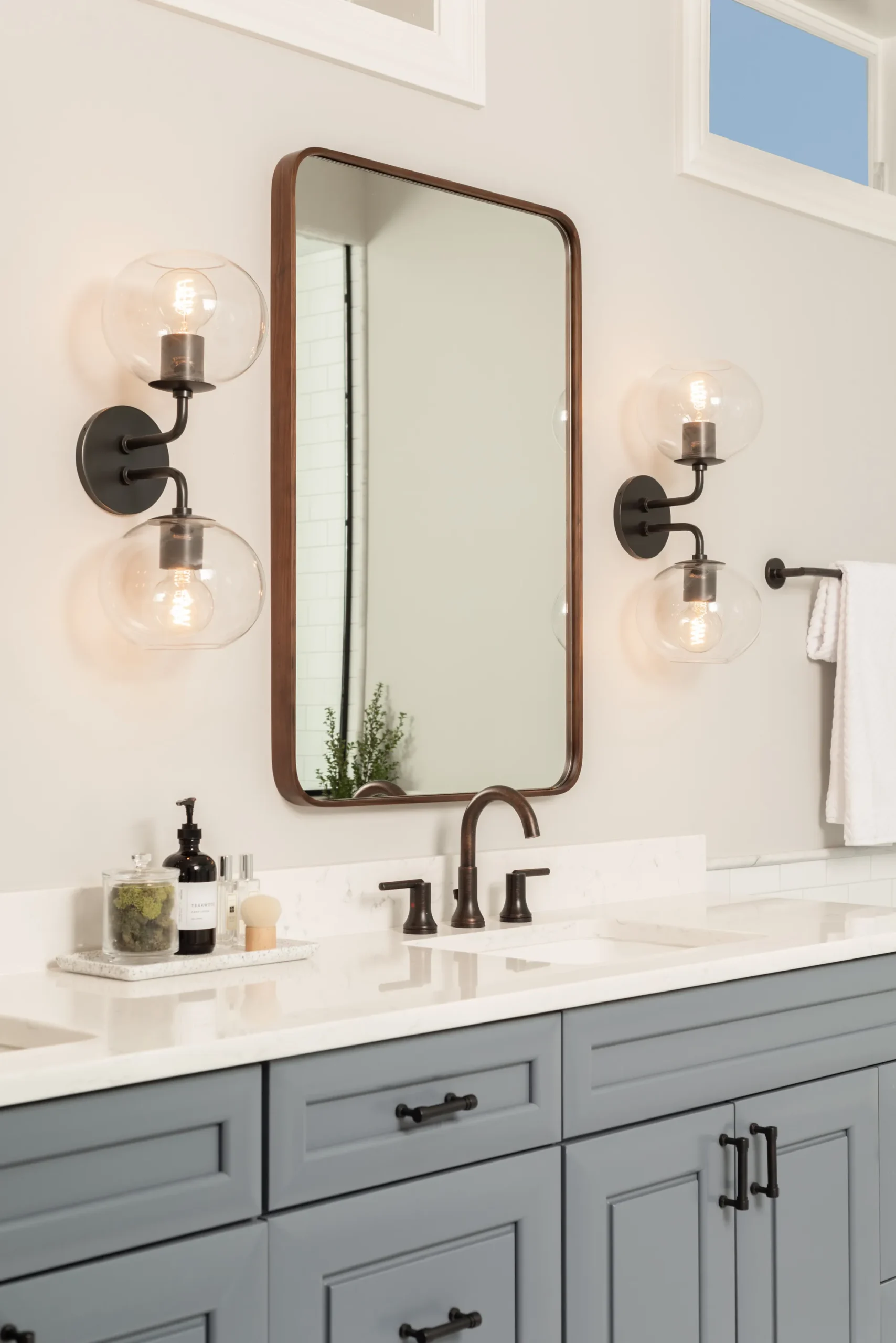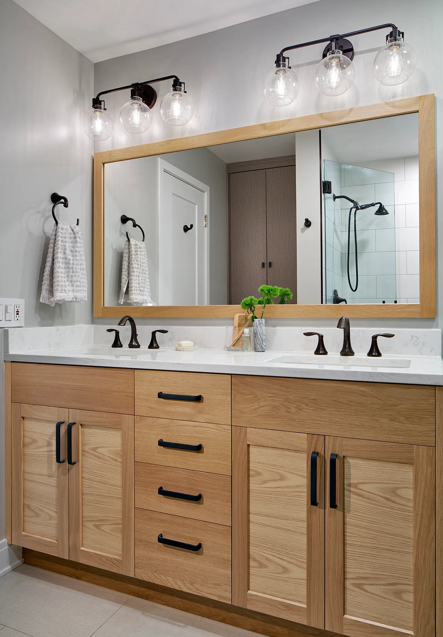Transitional primary bathroom with wood vanity, dual sinks, sleek black fixtures, large framed mirror, and glass globe lights. Elegant and functional design.