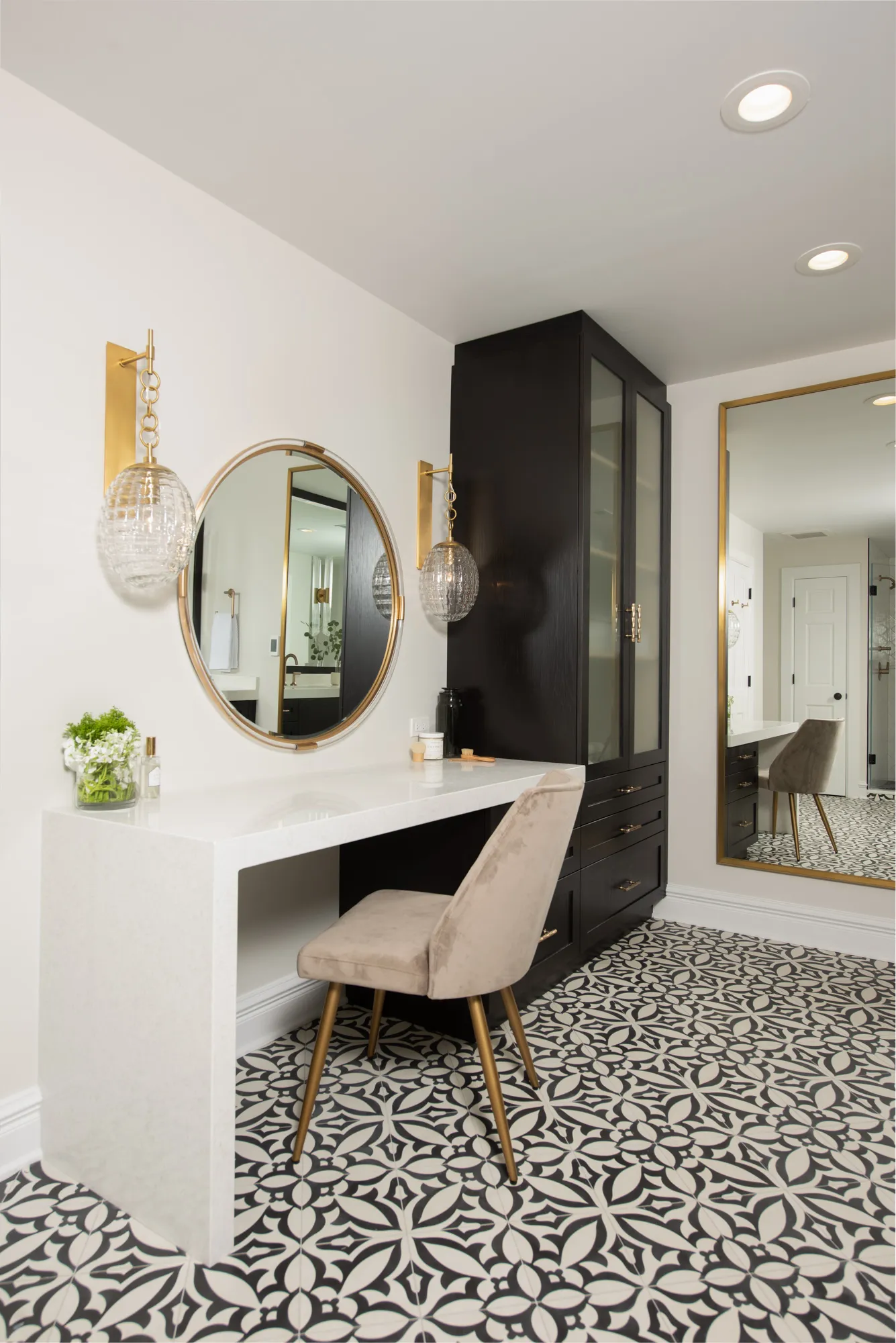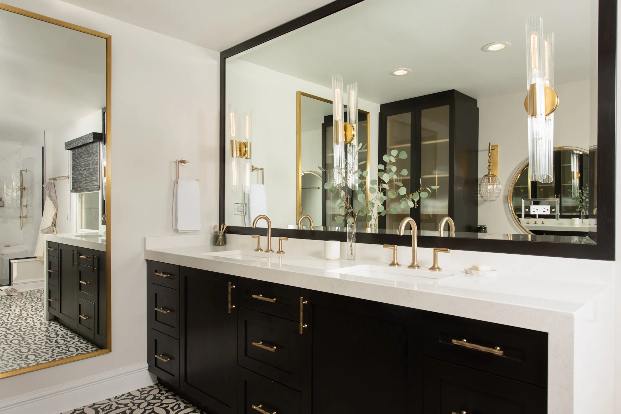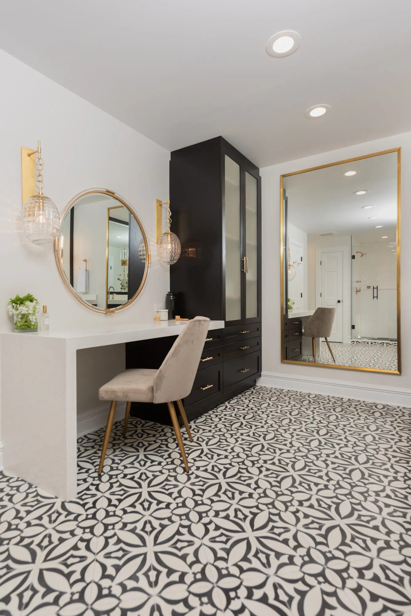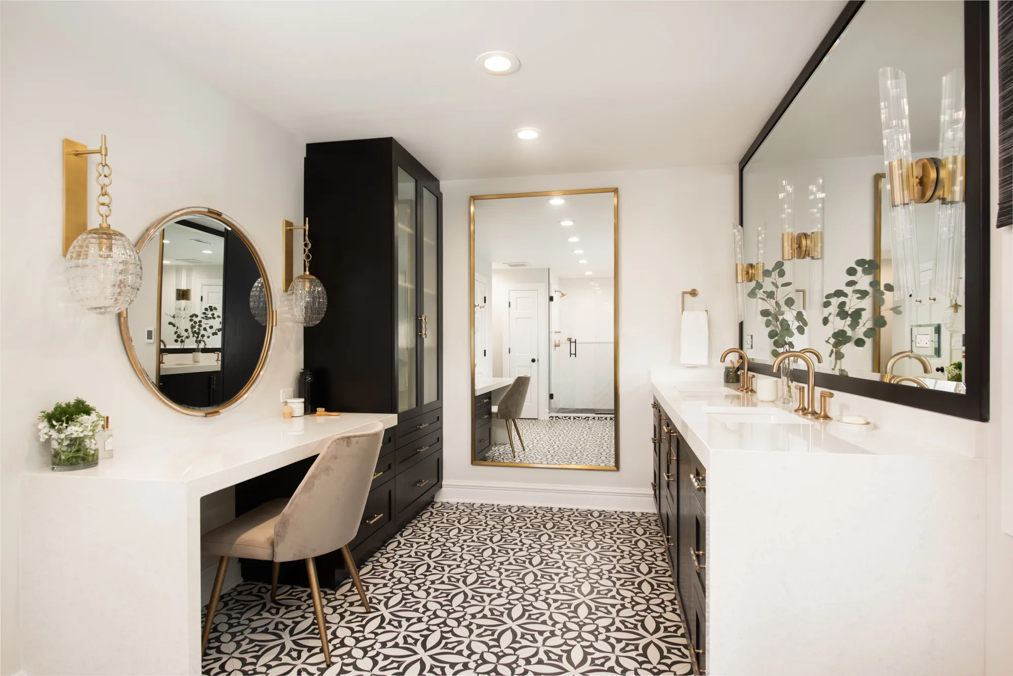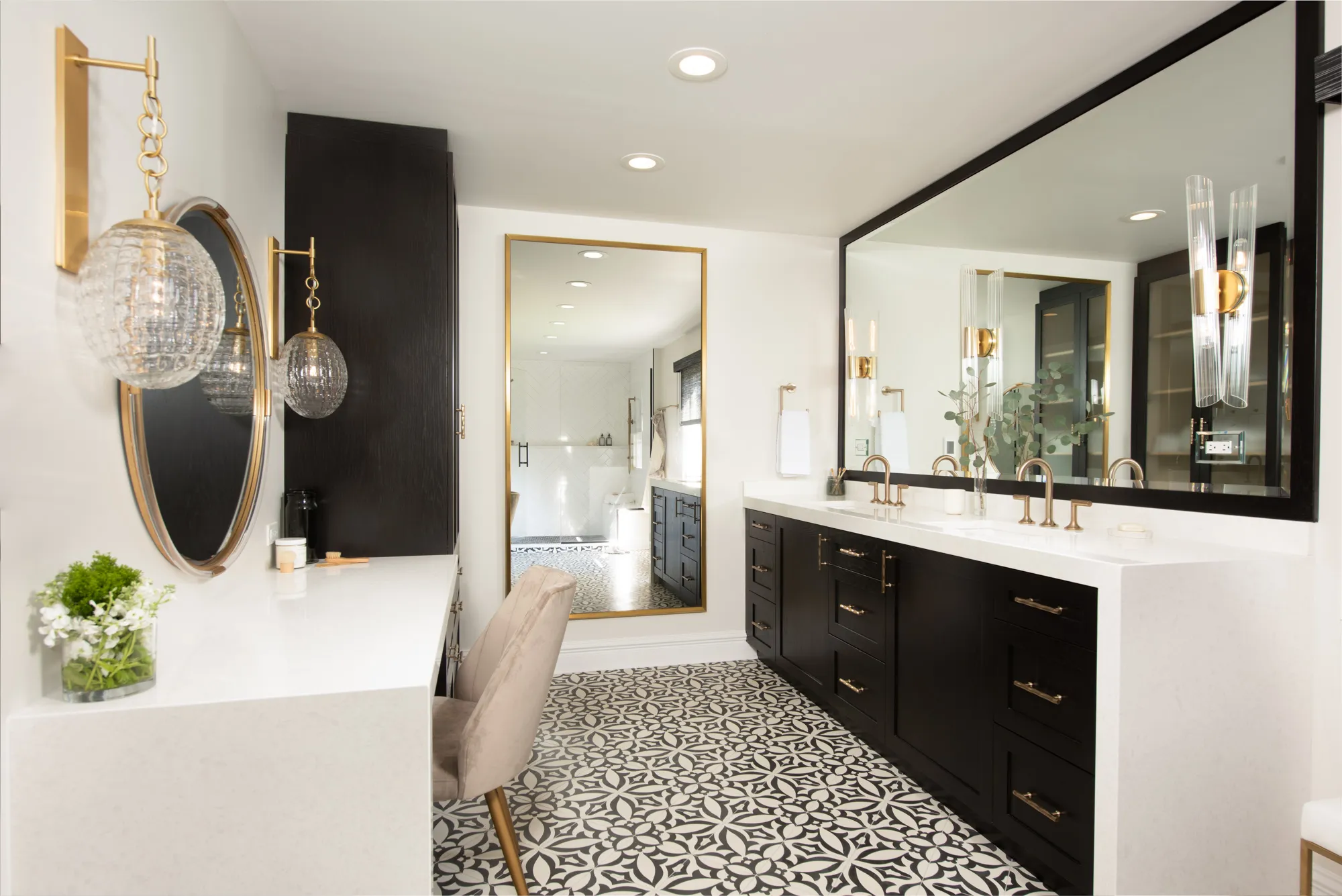 Transitional primary bathroom with striking black cabinetry, elegant double vanity, ornate tile floor, gold accents, and sleek mirrors.