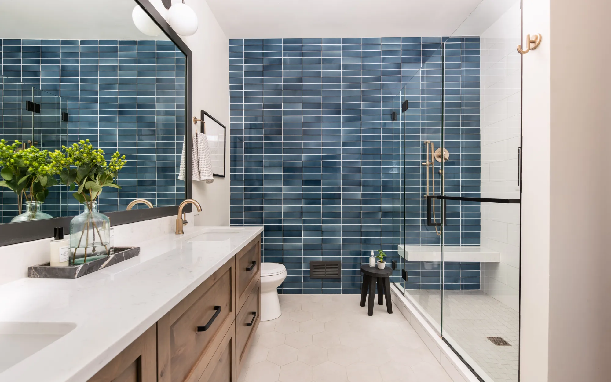 Transitional bathroom with glass shower, bold blue tiles, sleek white vanity, wood cabinetry, and hexagonal floor tiles for a modern classic look.