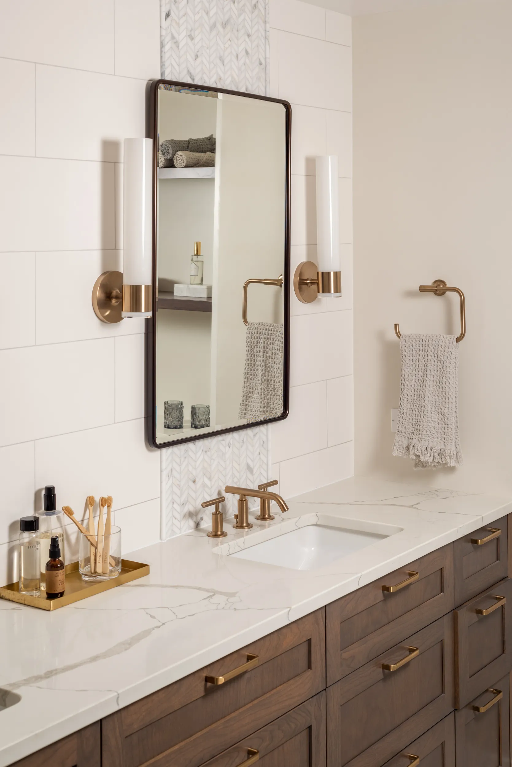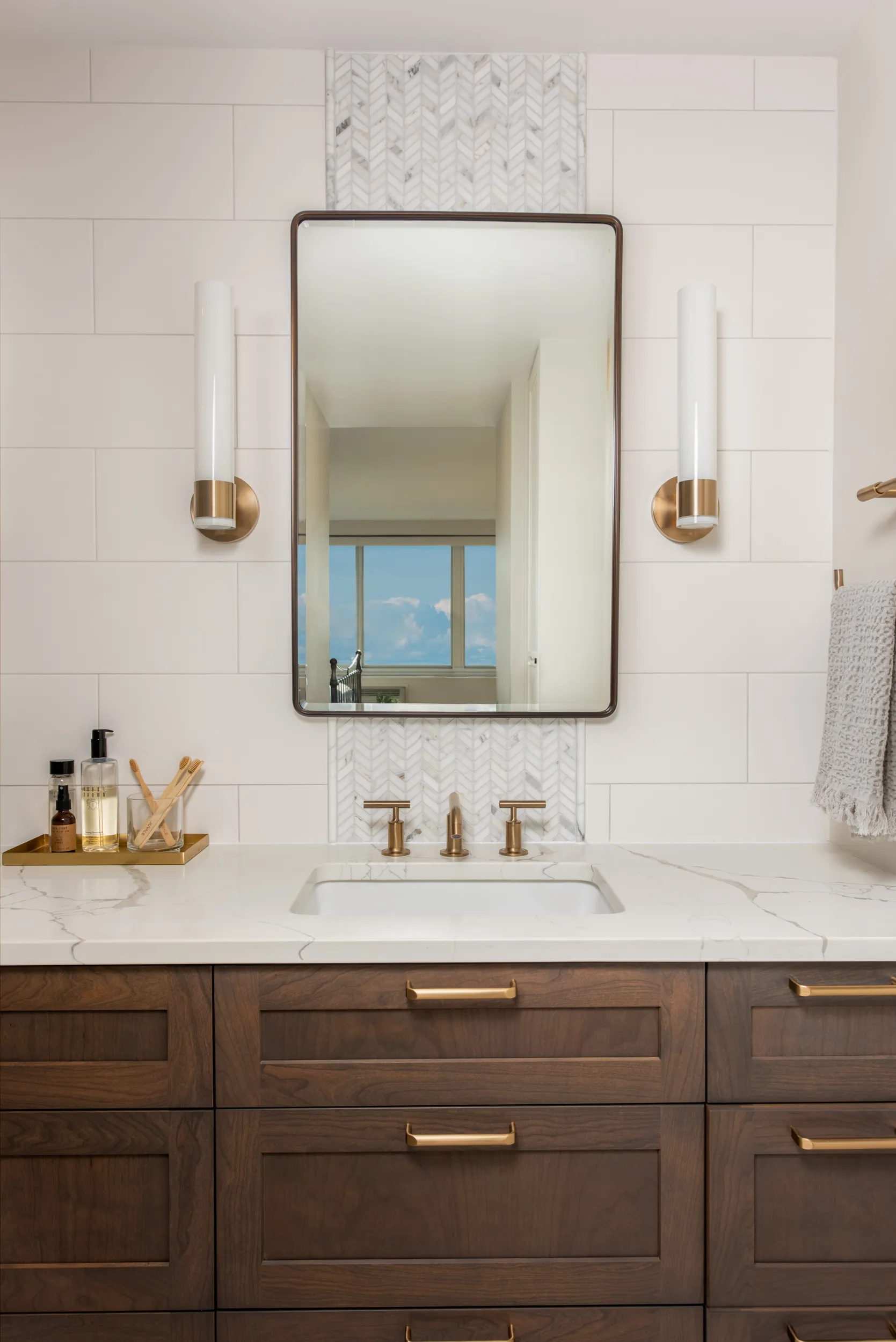 Transitional primary bathroom with elegant vanity, marble countertop, sleek mirror, and brass fixtures. Distinctive chevron tile adds unique character.