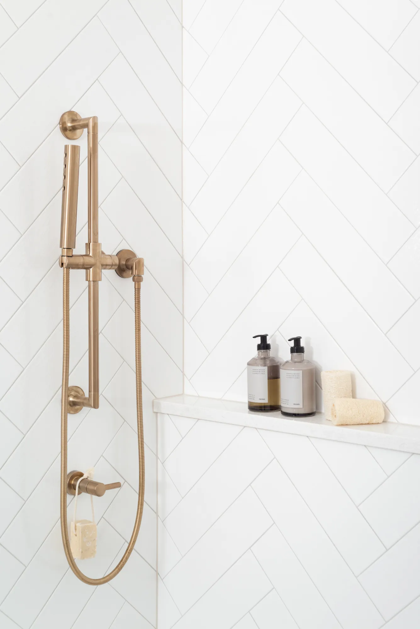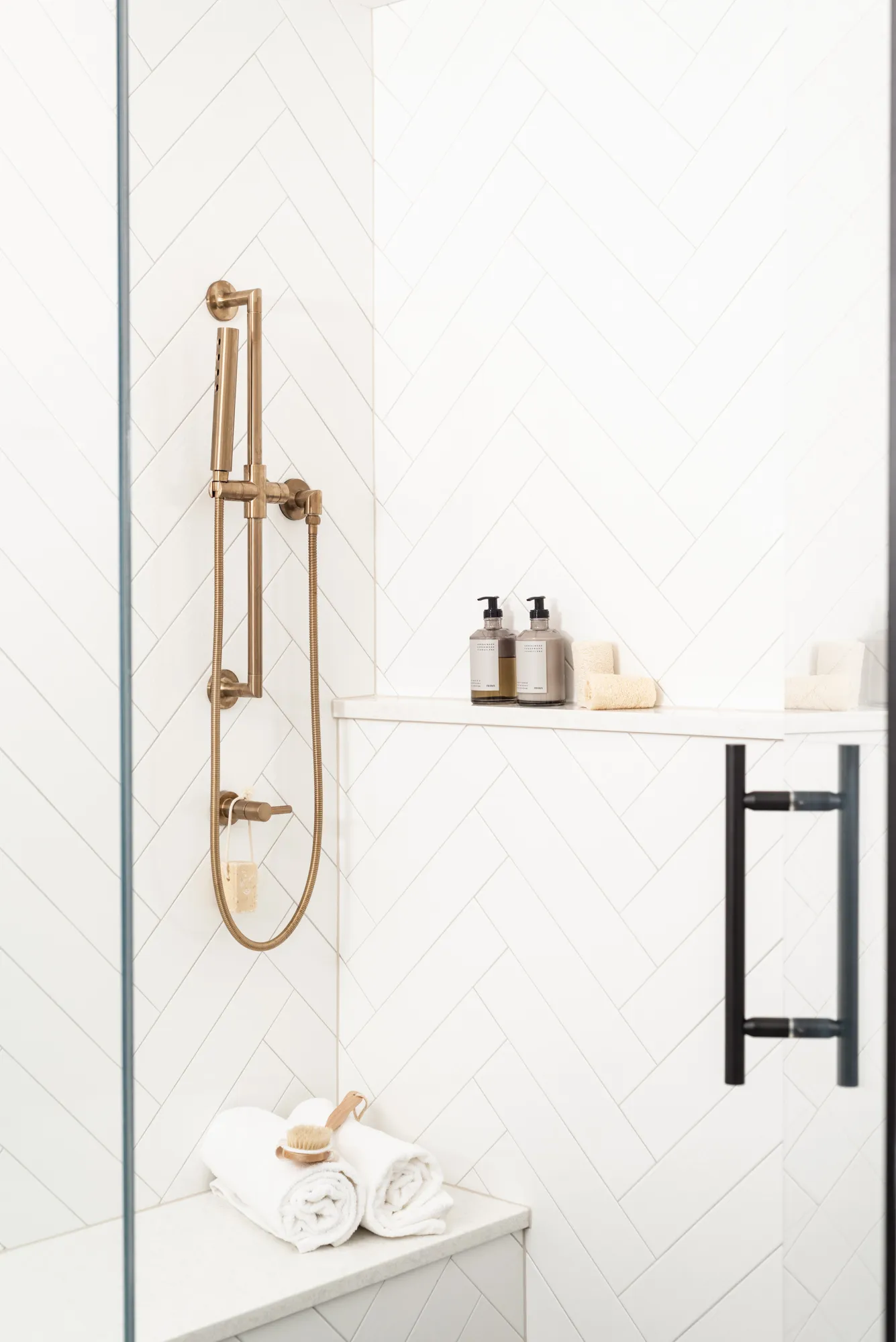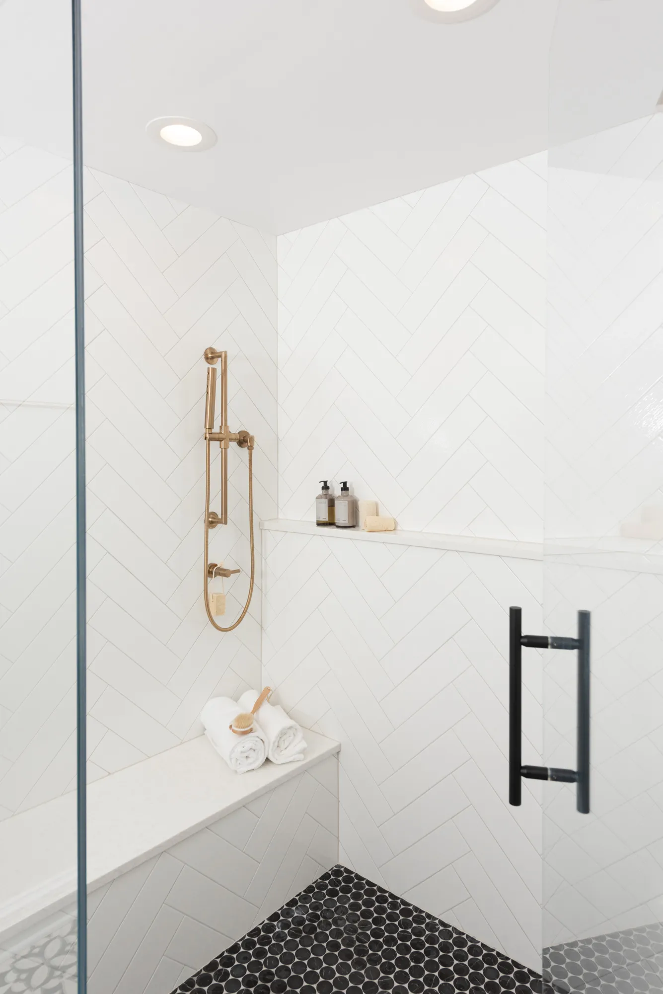Minimalist primary bathroom with brass fixtures, elegant herringbone tile design, and a glass partition. Clean, modern aesthetic.
