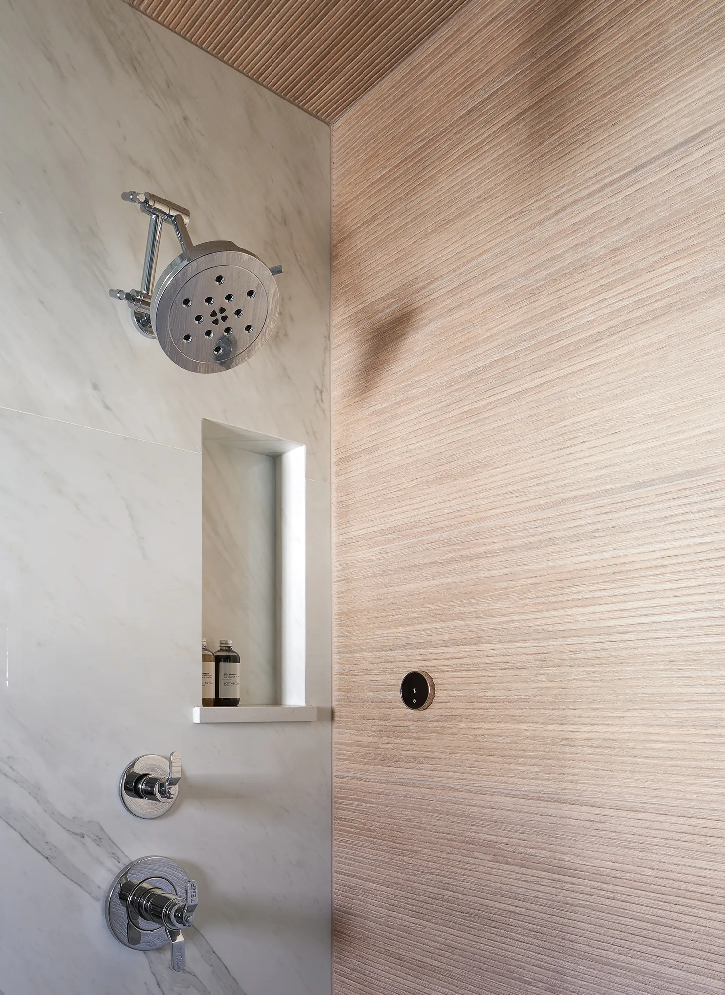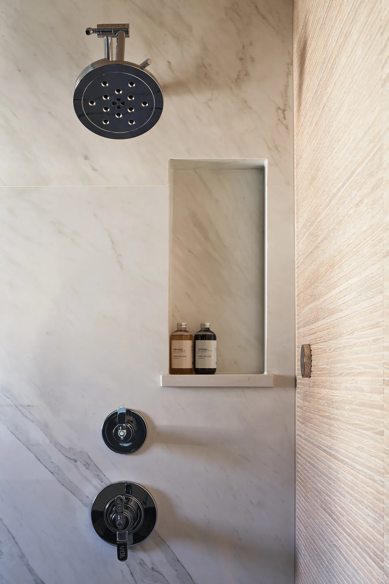 Minimalist primary bathroom showcasing sleek shower fixtures, recessed shelf, and elegant marble walls for a clean, sophisticated look.