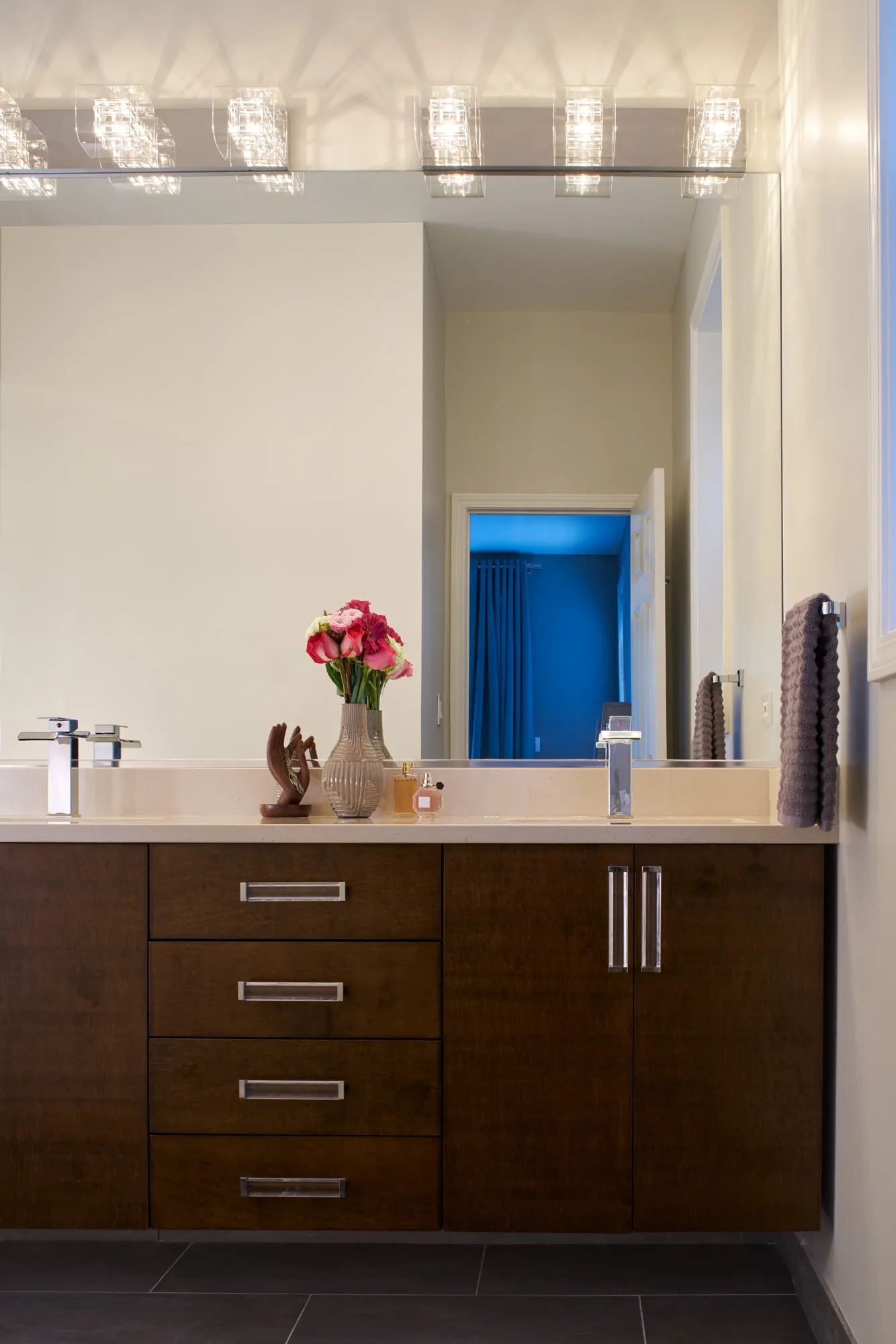 Contemporary primary bathroom with sleek fixtures, custom cabinetry, large mirror, and elegant lighting, showcasing modern architectural elements.