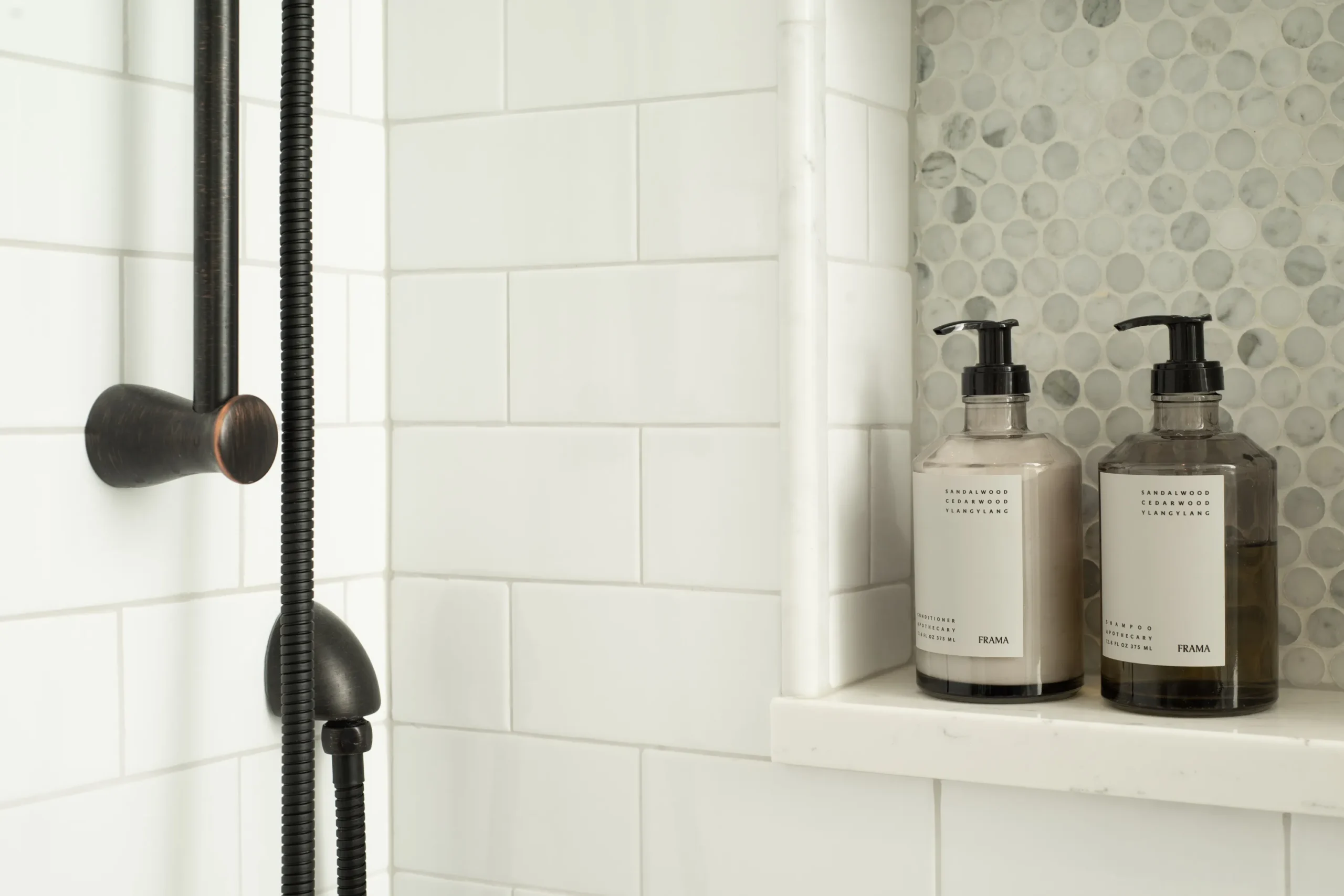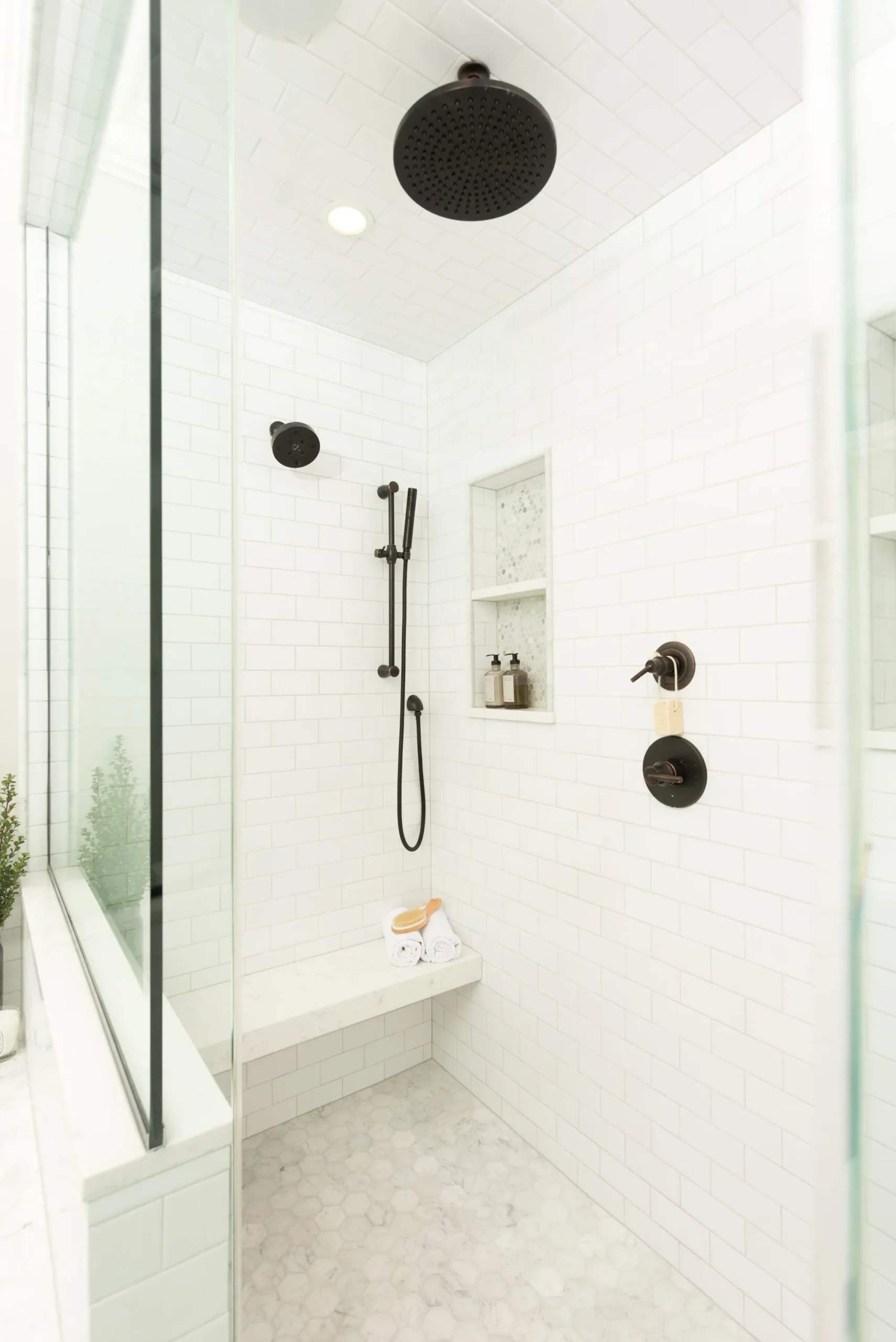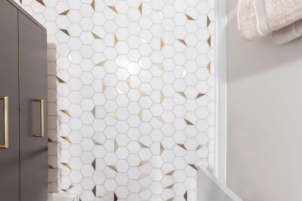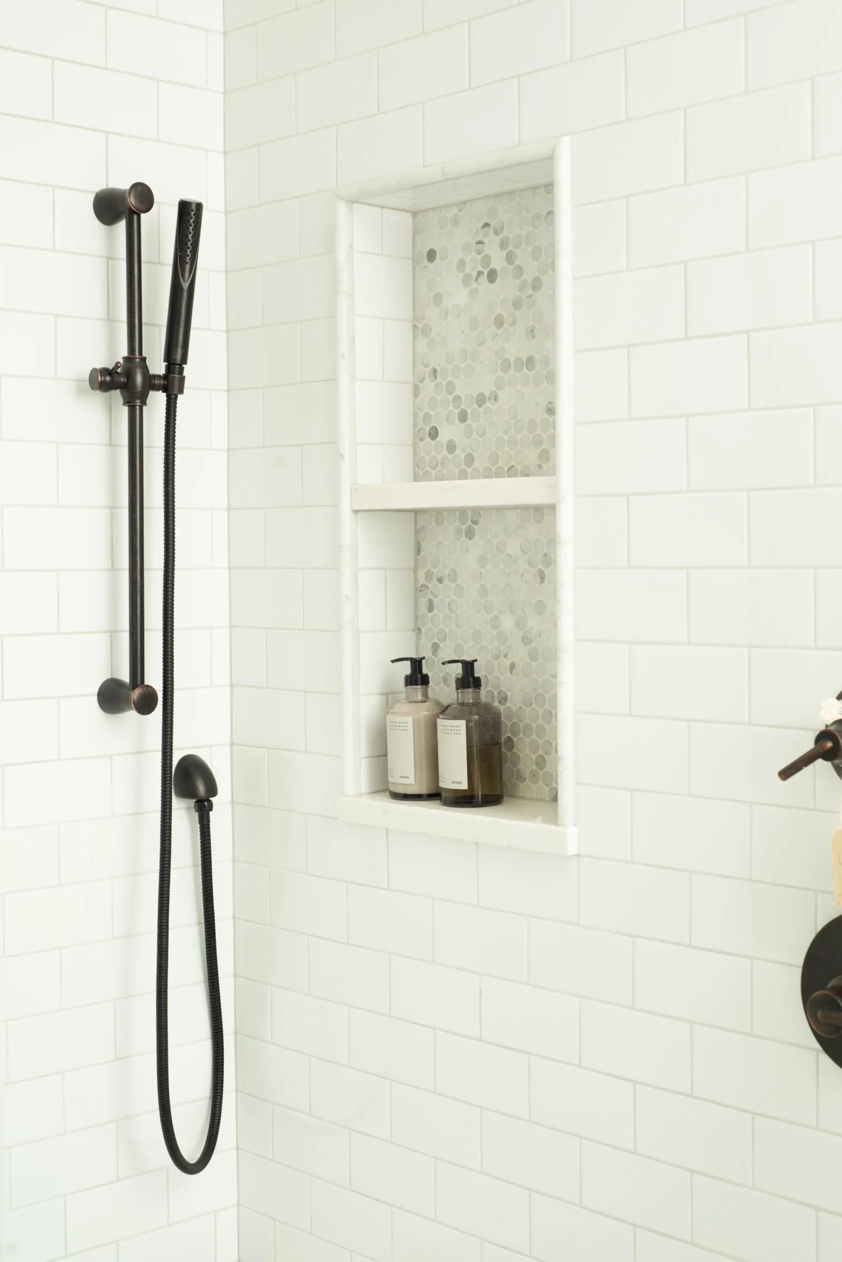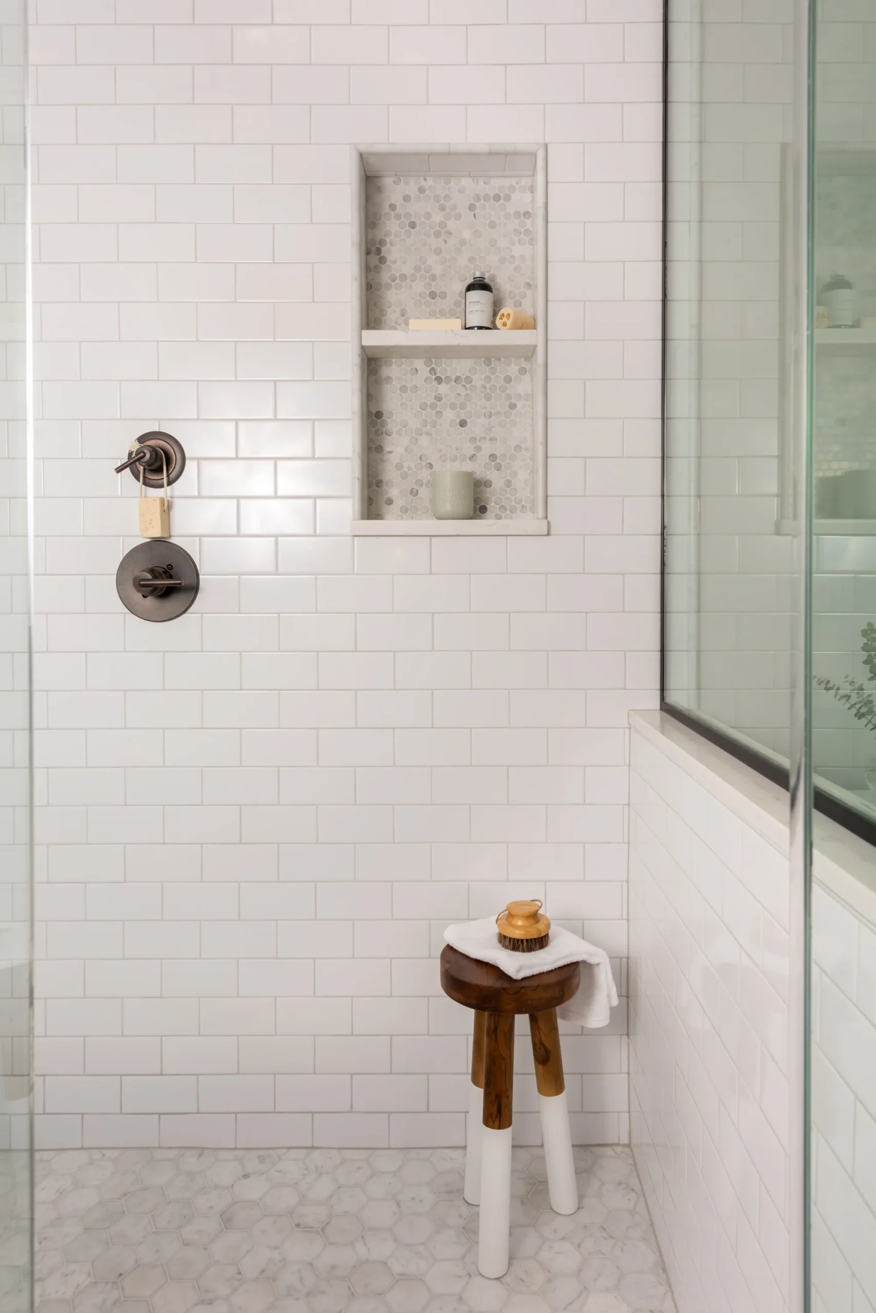 Minimalist primary bathroom with sleek shower fixture, hexagonal tile niche, and elegant white subway tiles.