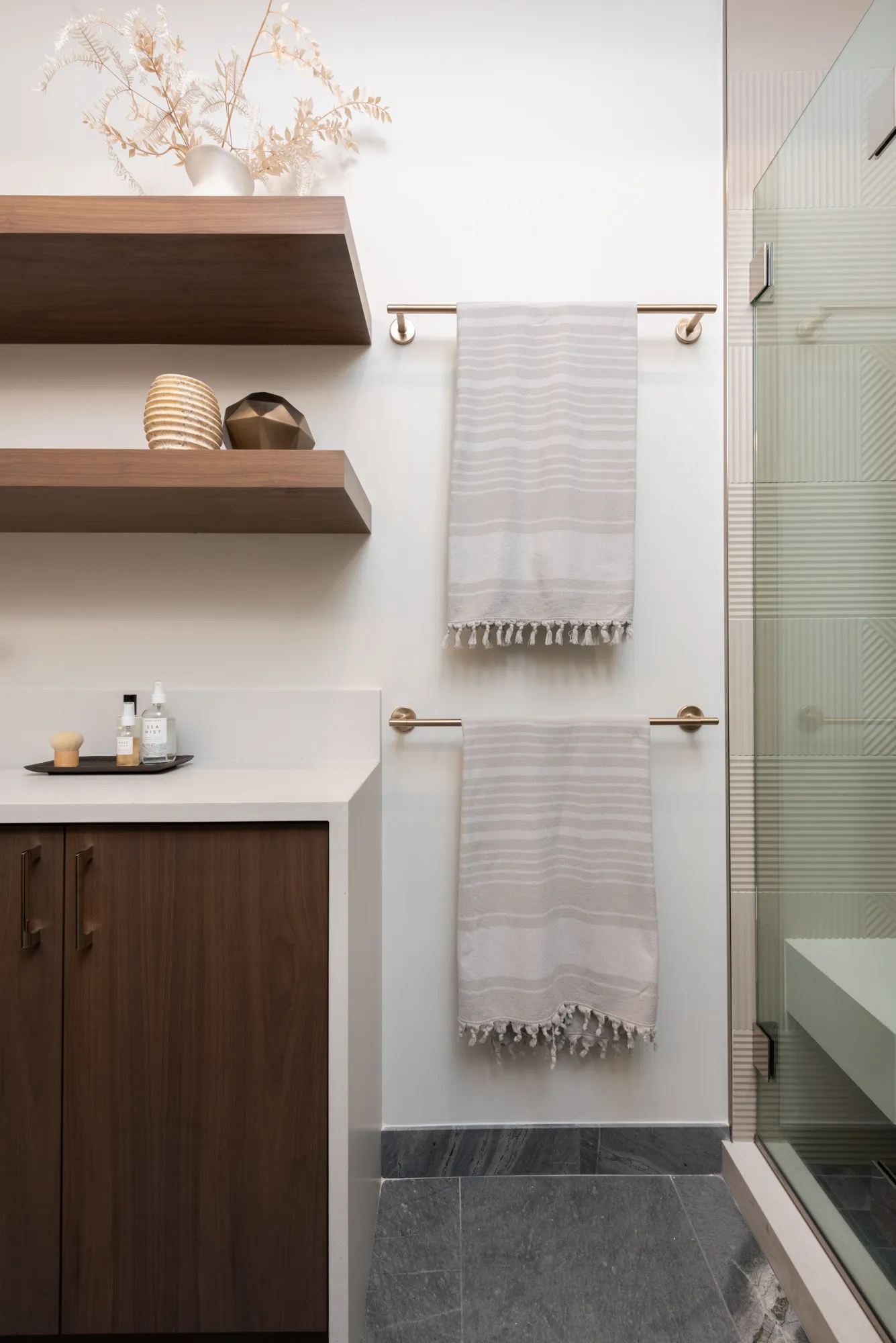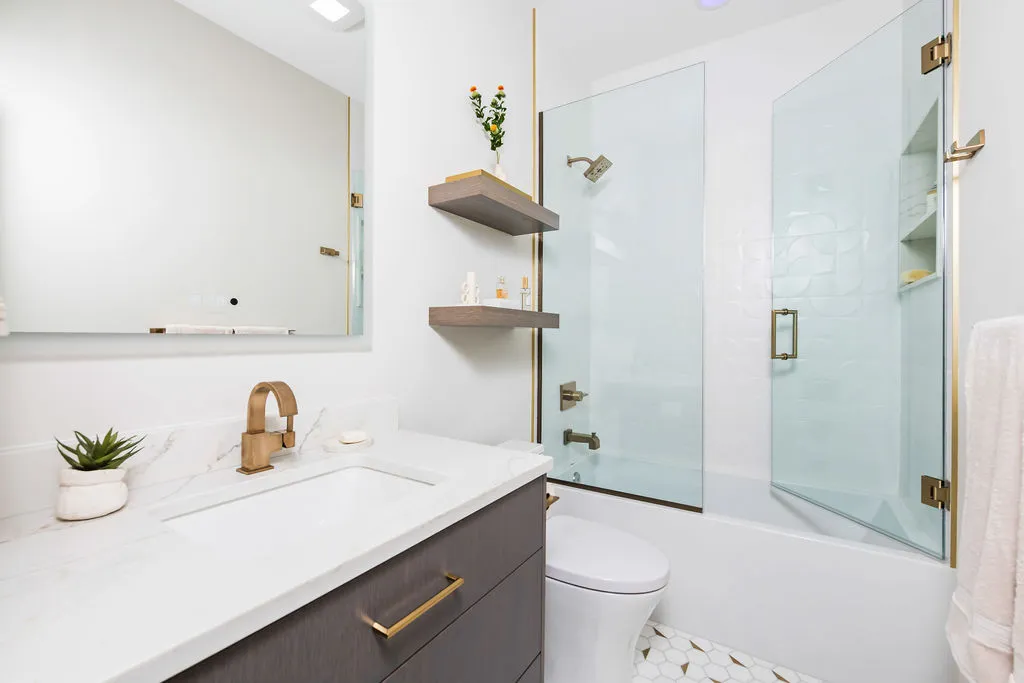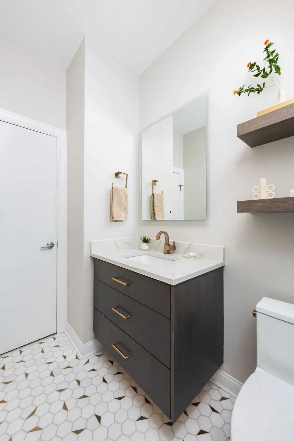Contemporary guest bathroom with marble countertop, bronze fixtures, floating shelves, hexagonal tile floor, and minimalist glass shower design.