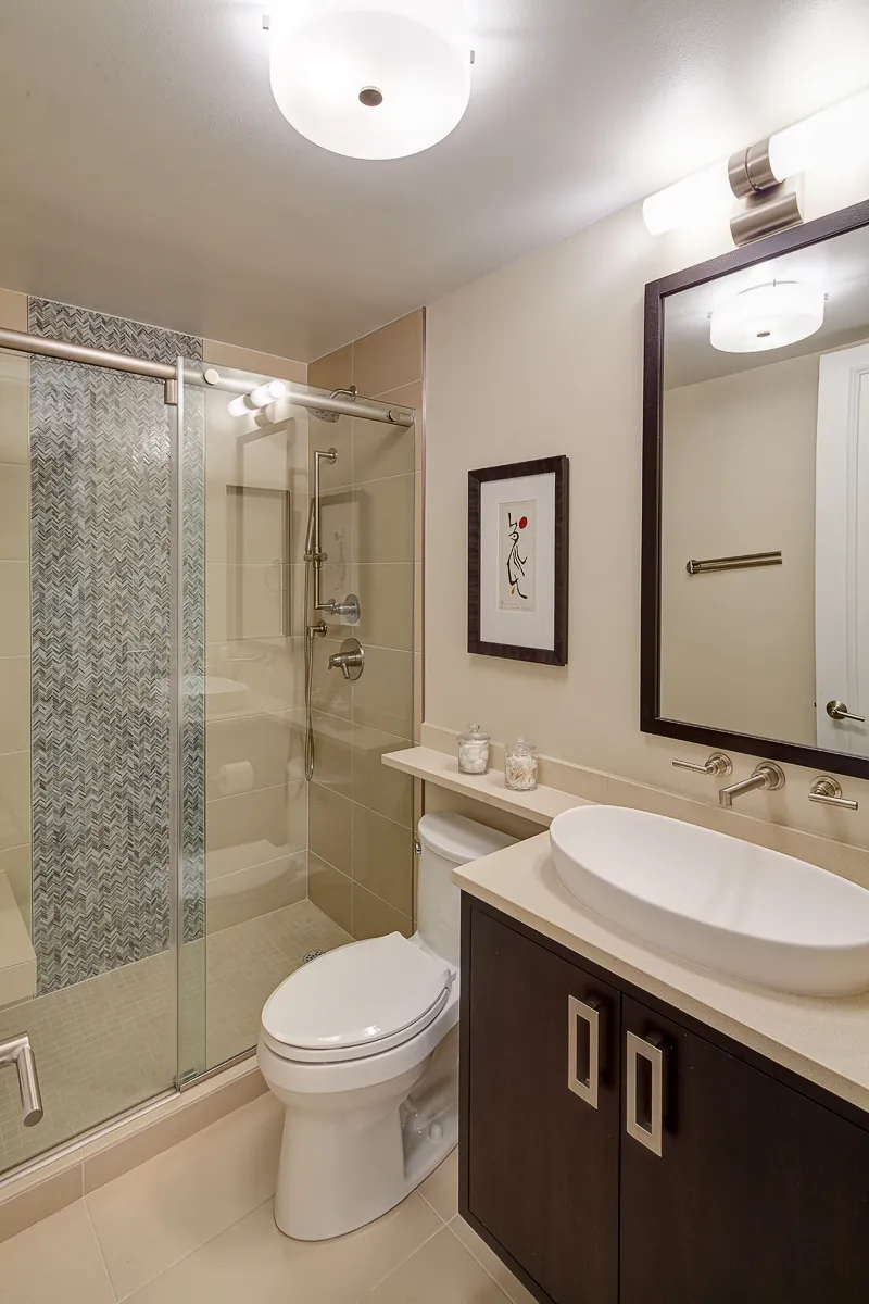 Contemporary bathroom featuring sleek glass shower, stylish vanity with vessel sink, wall artwork, and minimalist lighting for a modern ambiance.