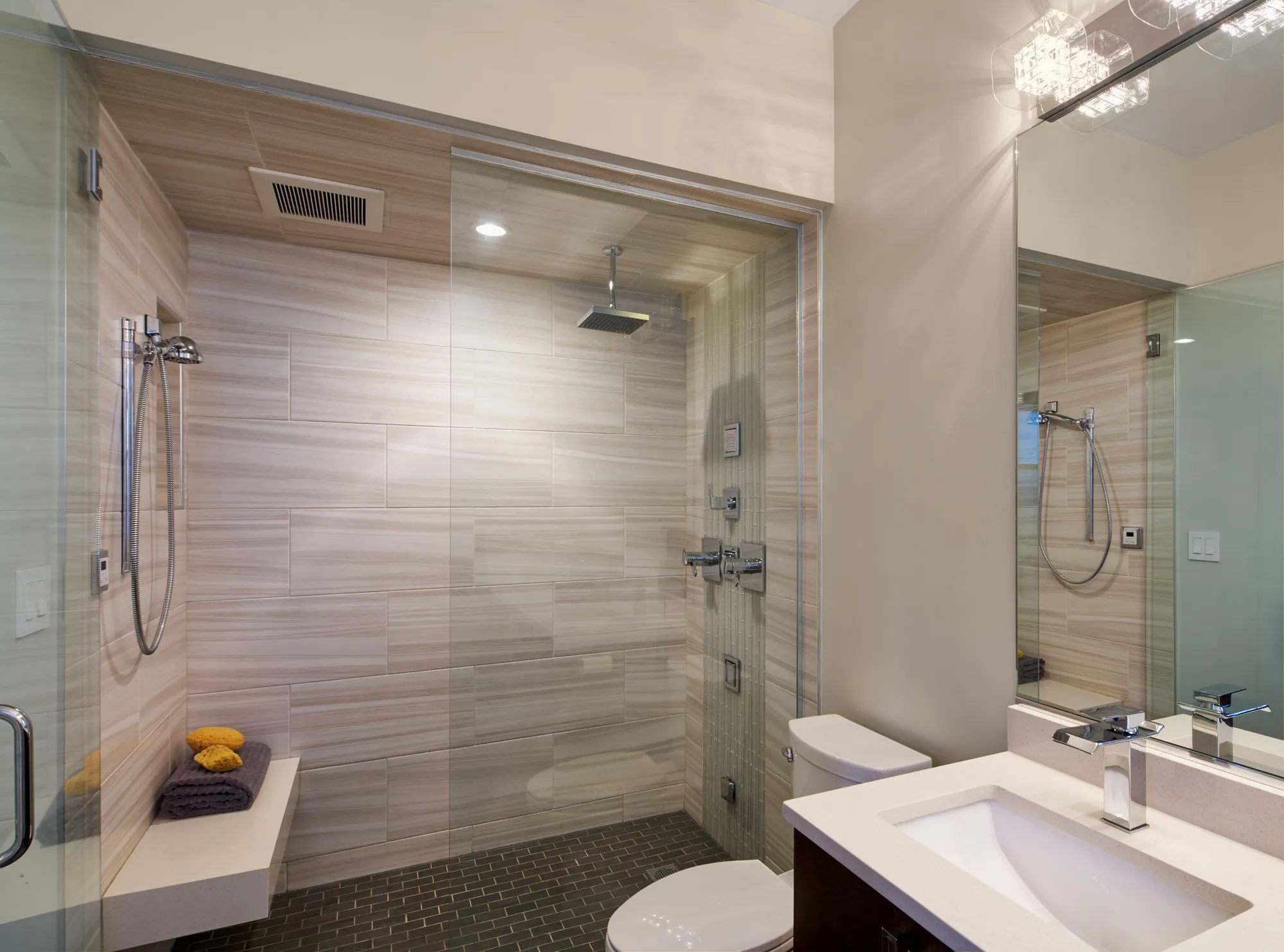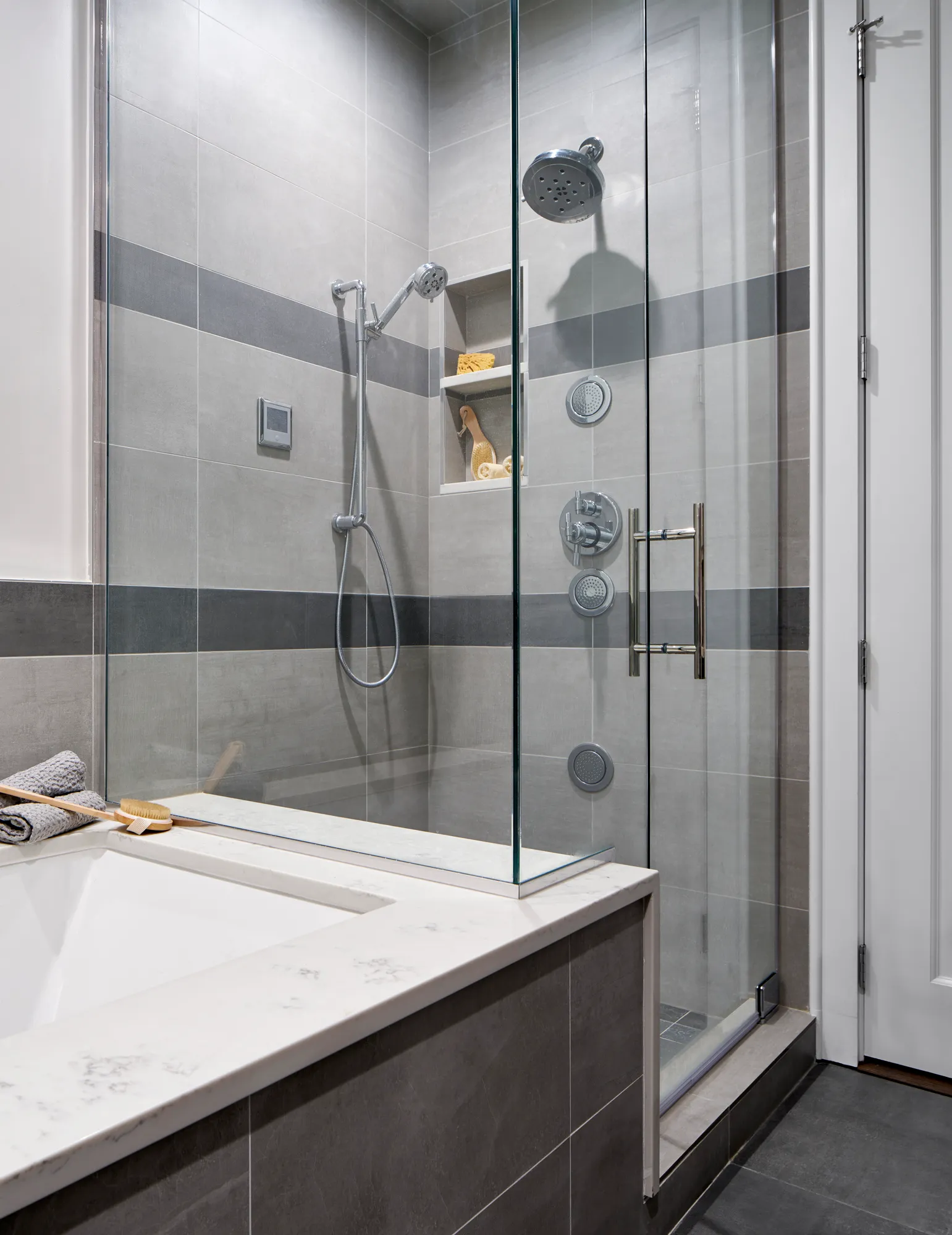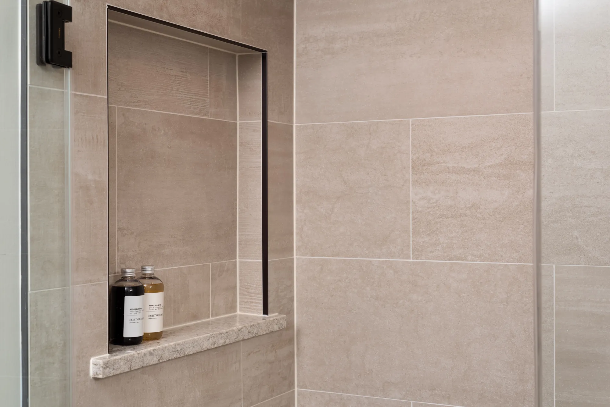 Contemporary bathroom with sleek glass shower, textured tile walls, and built-in niche. Modern fixtures enhance the clean, minimalist design.
