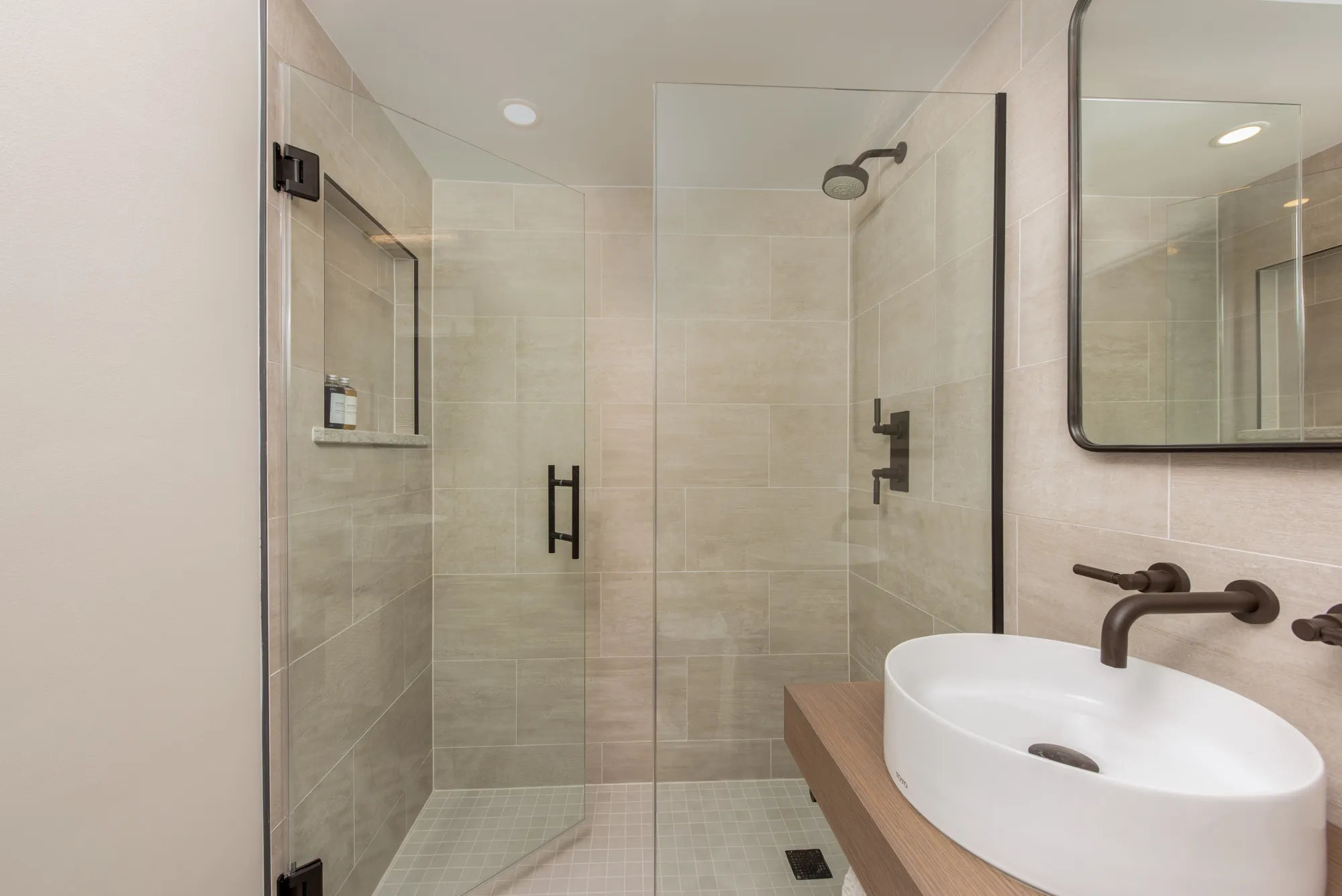 Minimalist guest bathroom with sleek glass shower, elegant round vessel sink, black fixtures, and subtle tile design creating a serene aesthetic.