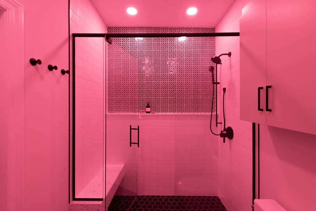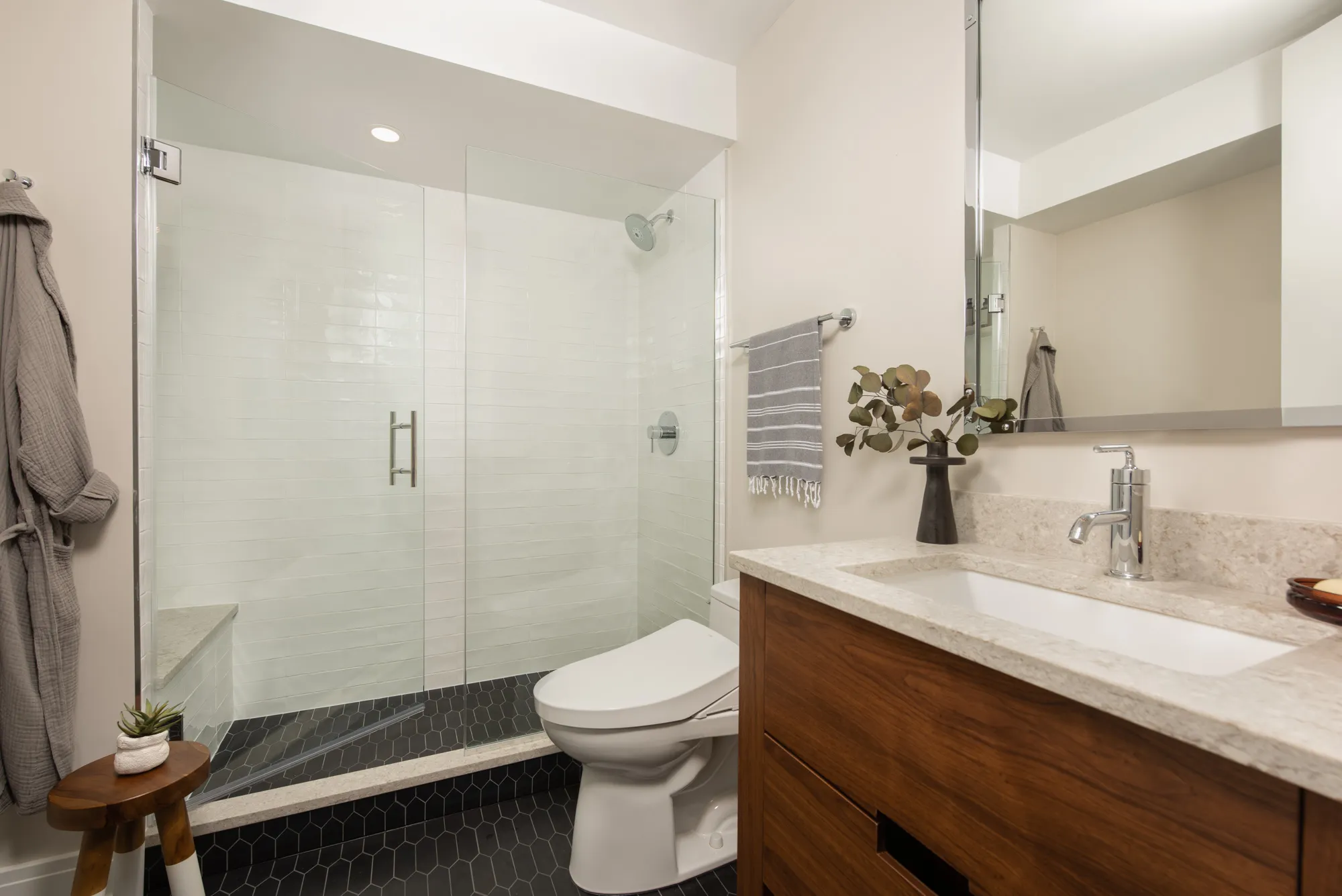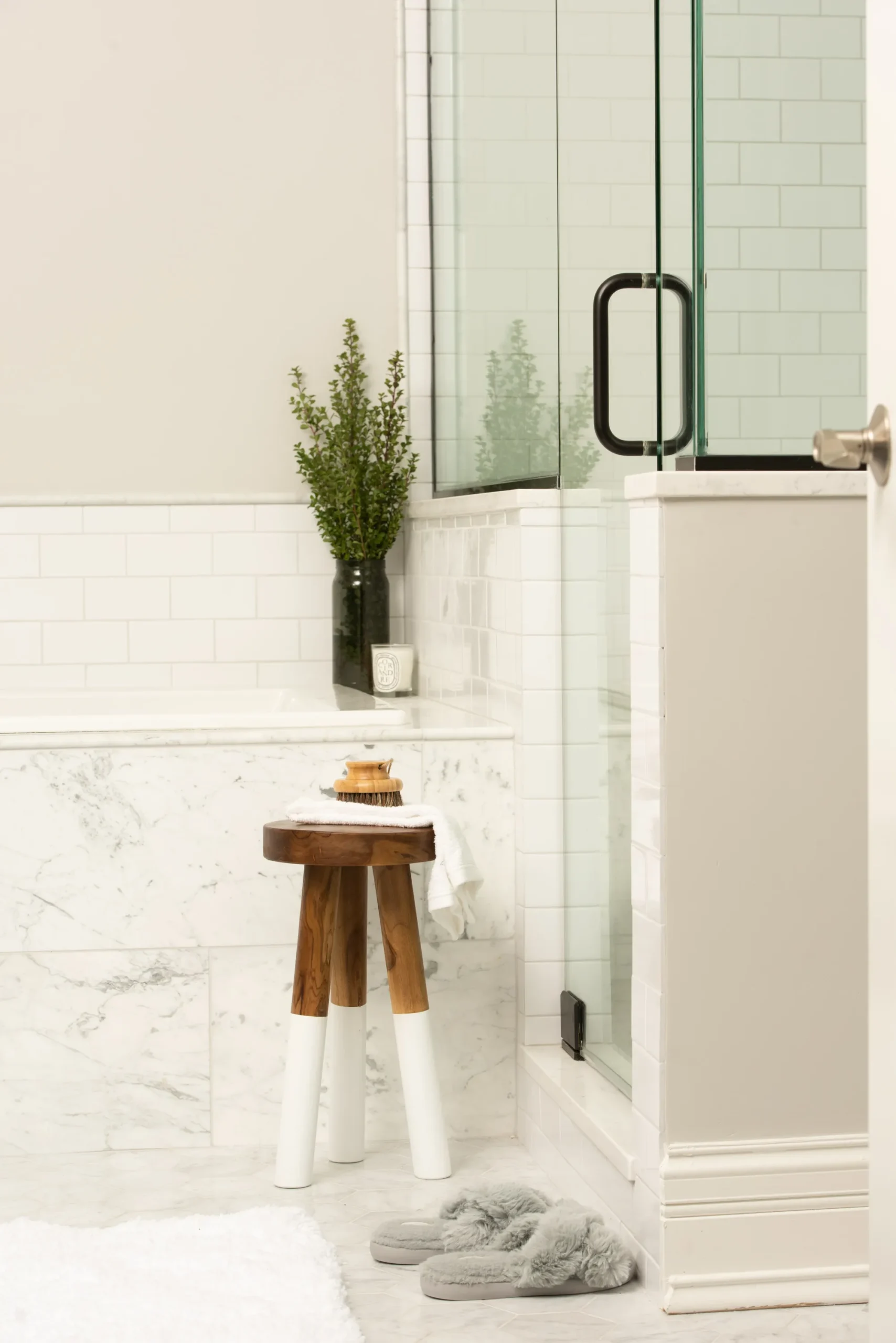 Contemporary primary bathroom with sleek glass shower, marble tiles, and integrated lighting. Features accent stool and lush planter for modern elegance.