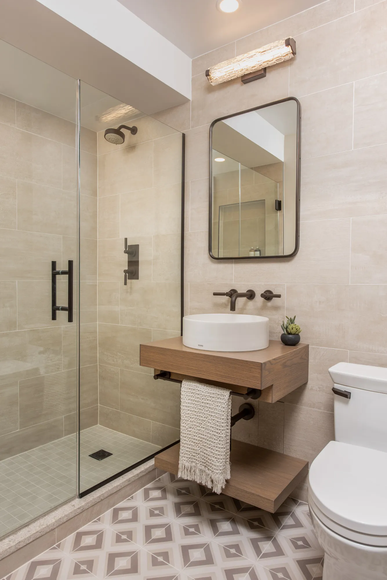 Modern guest bathroom with sleek glass shower, floating wood vanity, geometric flooring, and chic lighting. Contemporary faucet and mirror accentuate style.