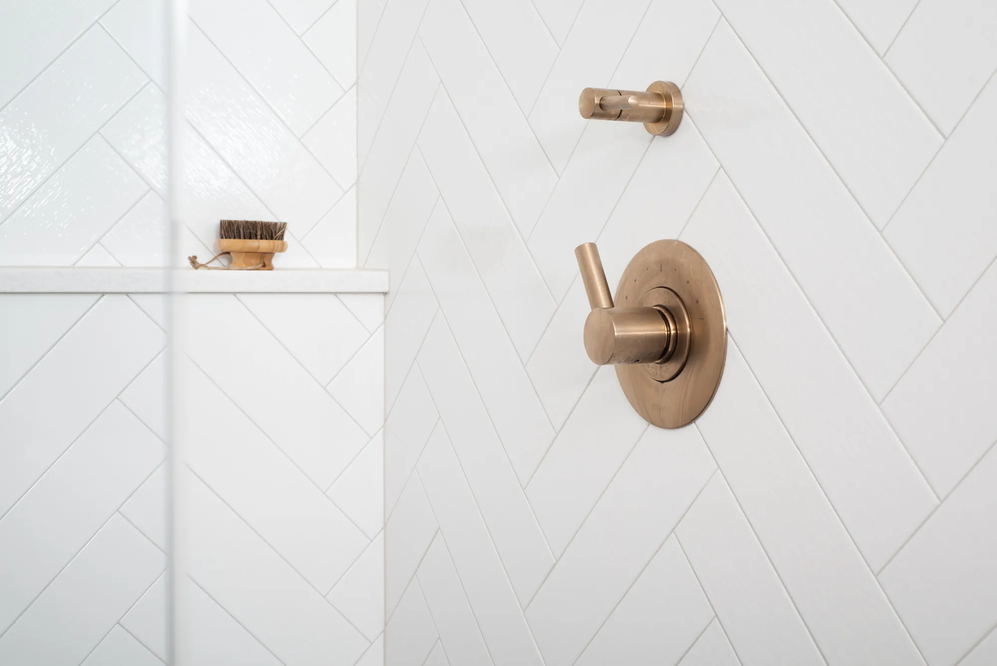 Minimalist primary bathroom with sleek bronze fixtures on herringbone-tiled walls, showcasing elegant and modern architectural design.