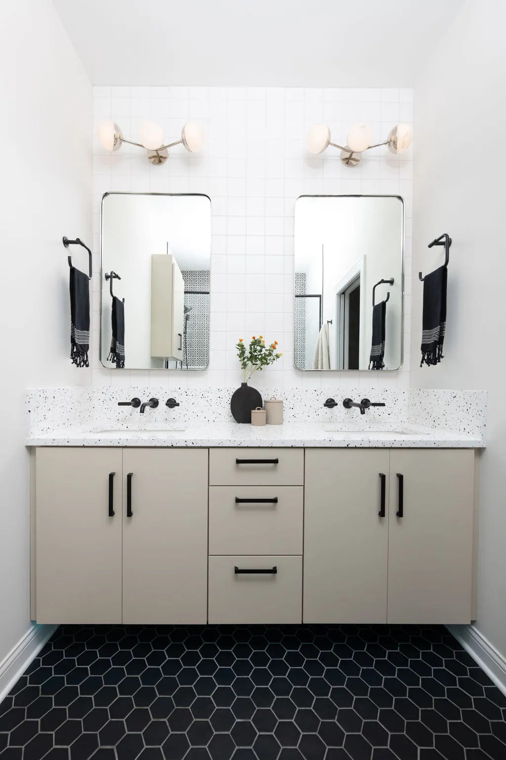 Modern primary bathroom with sleek cabinetry, hexagonal tile flooring, dual mirrors, and chic sconces. White walls contrast with black fixtures.
