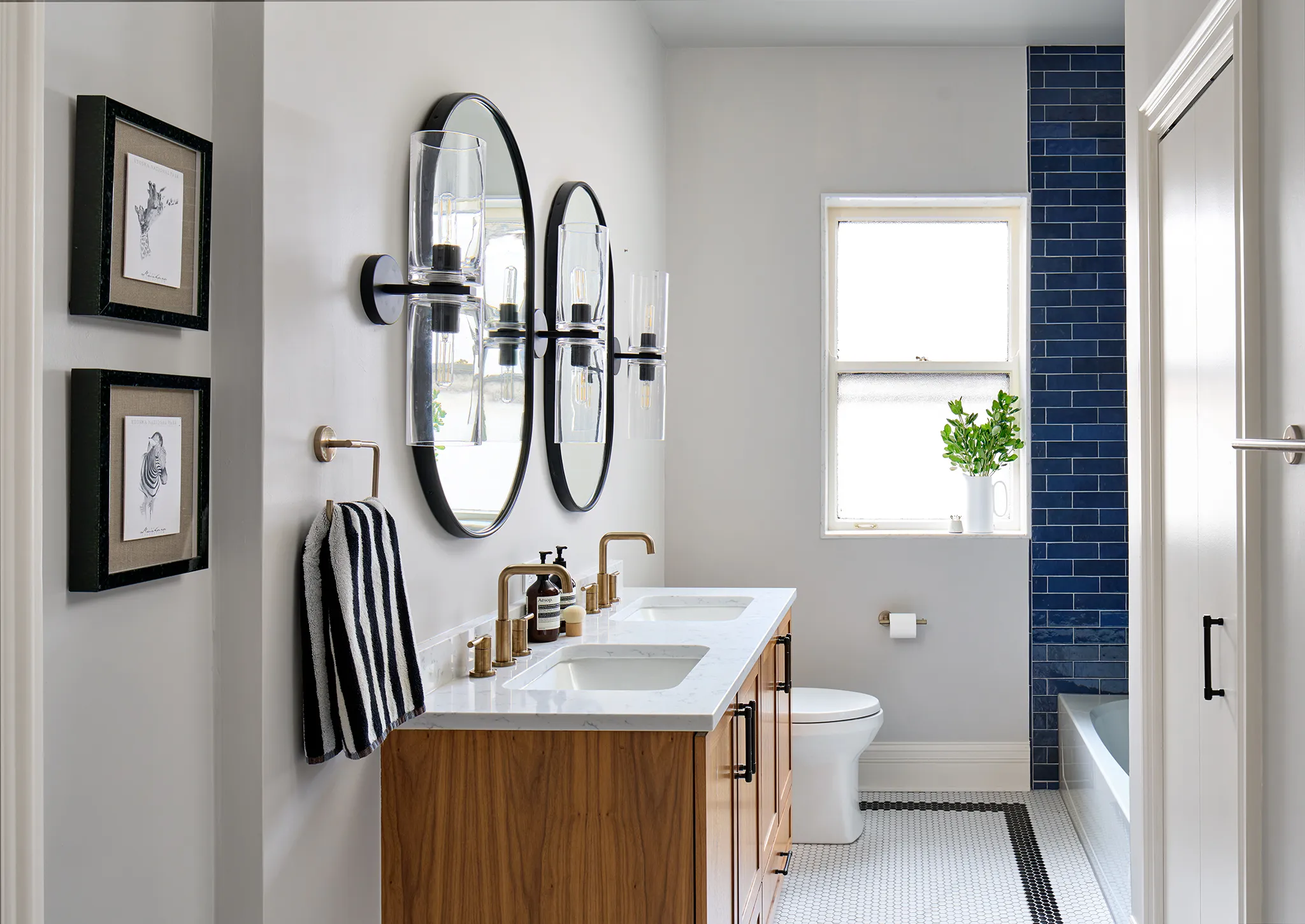 Transitional primary bathroom with sleek navy tiles, wood cabinetry, large framed mirror, modern sconces, and elegant brass fixtures.