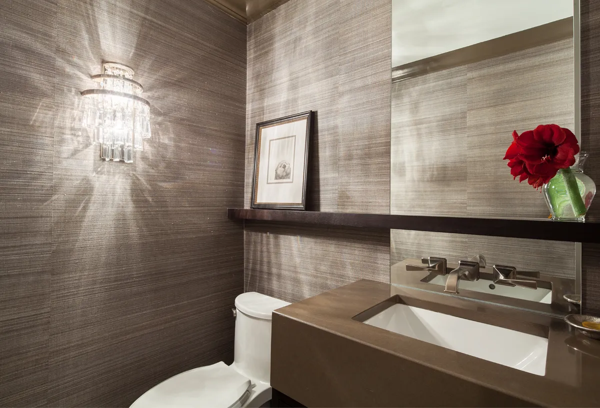 Transitional bathroom with textured wallpaper, elegant wall sconce, sleek floating vanity, and modern fixtures, enhanced by a vase with a red flower.