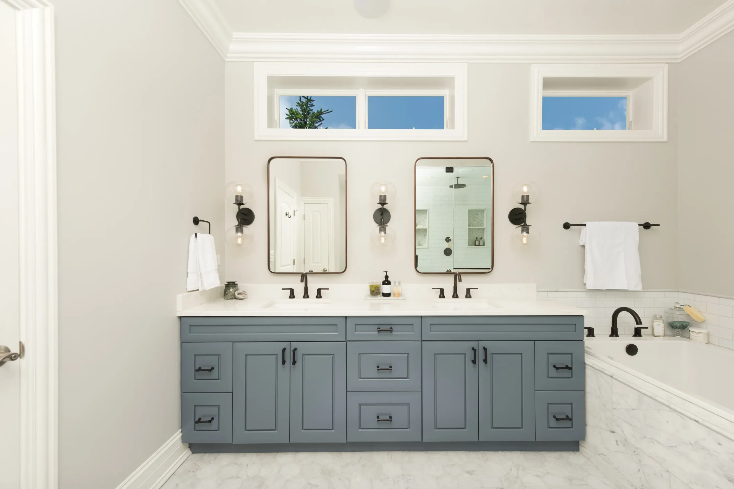 Transitional primary bathroom with elegant blue cabinetry, three vertical mirrors, black fixtures, and marble accents complementing rectangular transom windows.