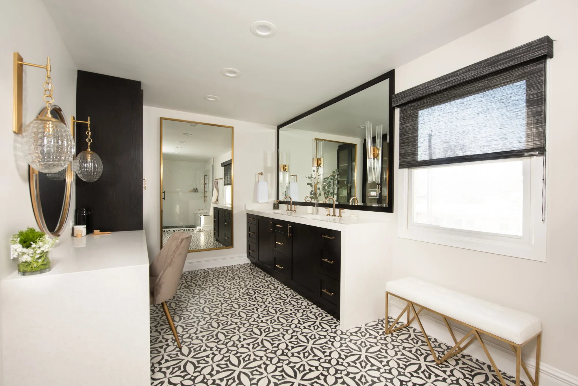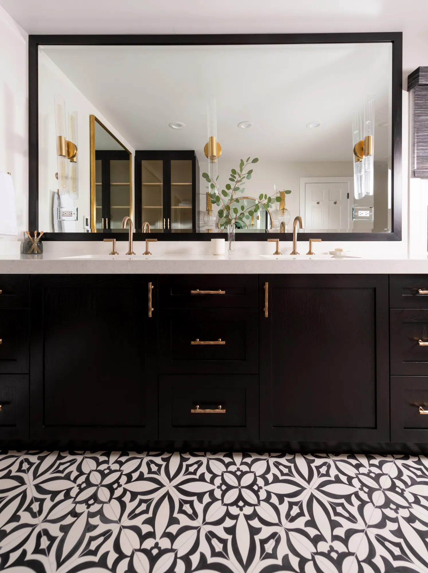 Transitional primary bathroom with bold tile flooring, sleek black cabinetry, large mirror, and brass accents creating a harmonious blend of elegance.