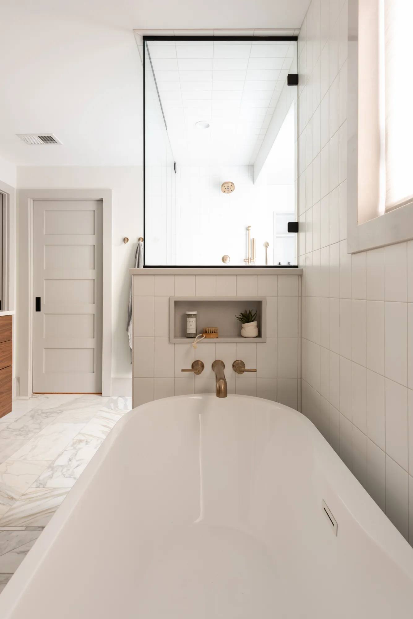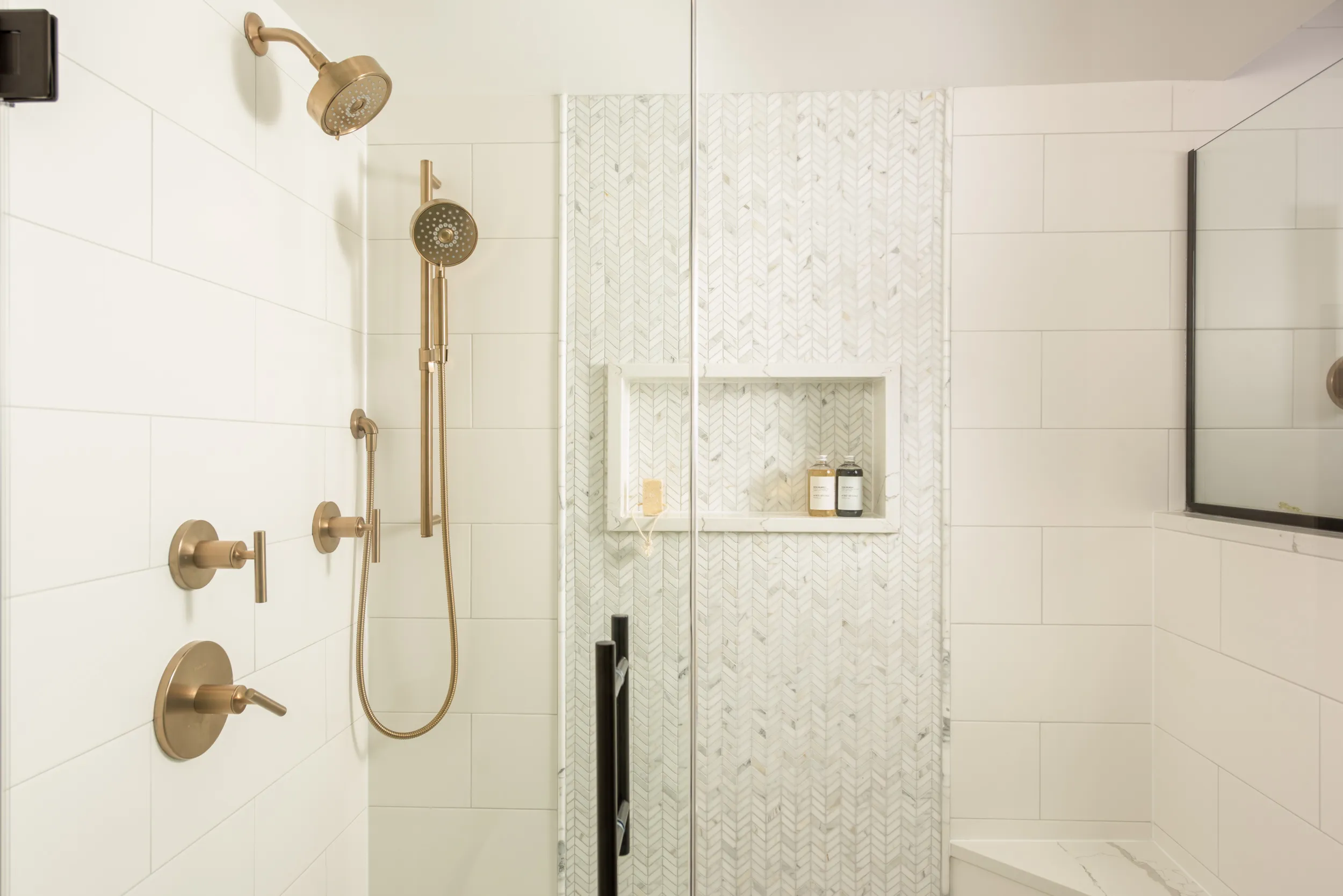 Contemporary primary bathroom with gold fixtures, sleek herringbone tiles, and elegant built-in shelf for a sophisticated touch.