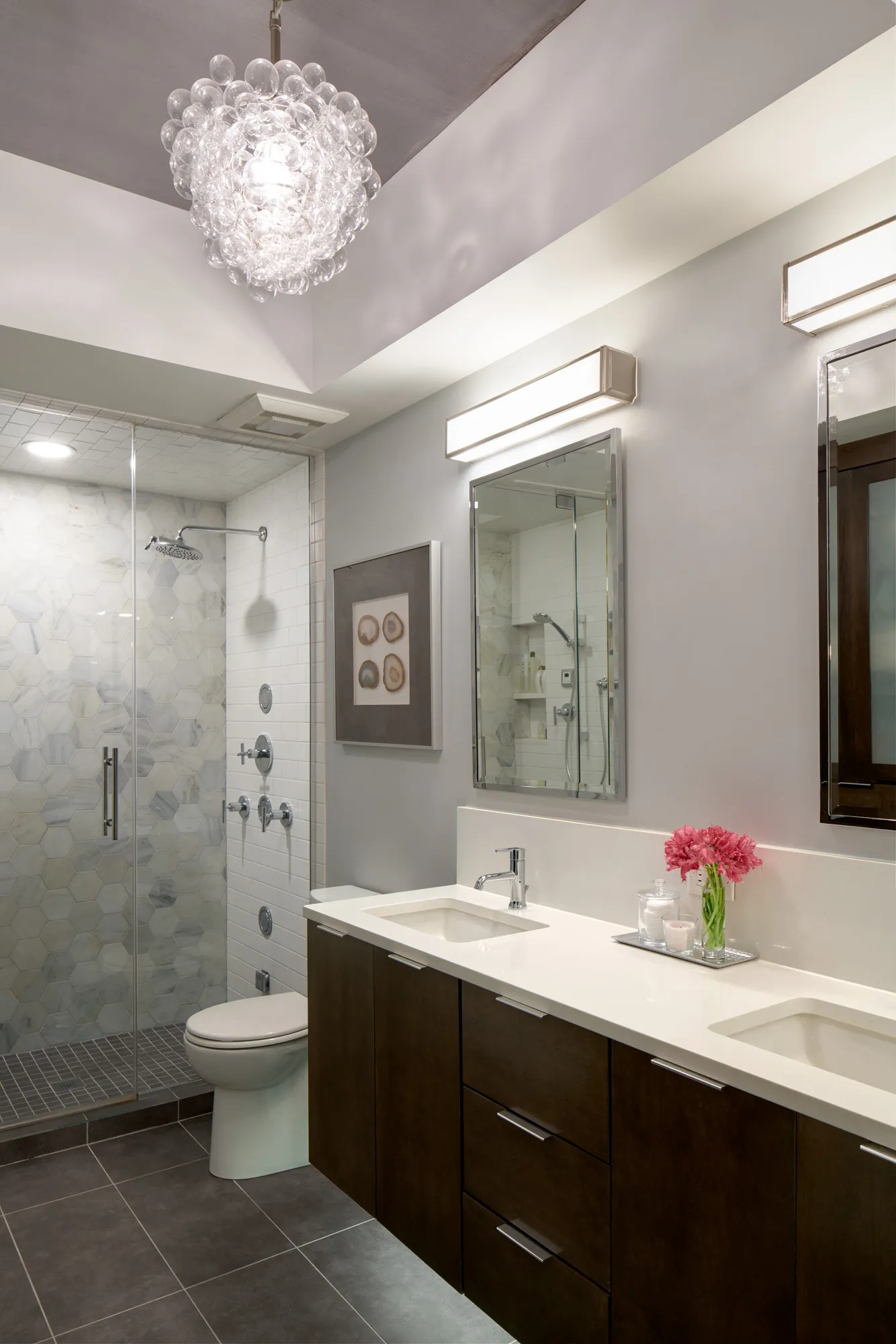 Contemporary primary bathroom with glass shower, dual sinks, dark wood vanity, geometric tiles, and a chic bubble chandelier for stylish elegance.