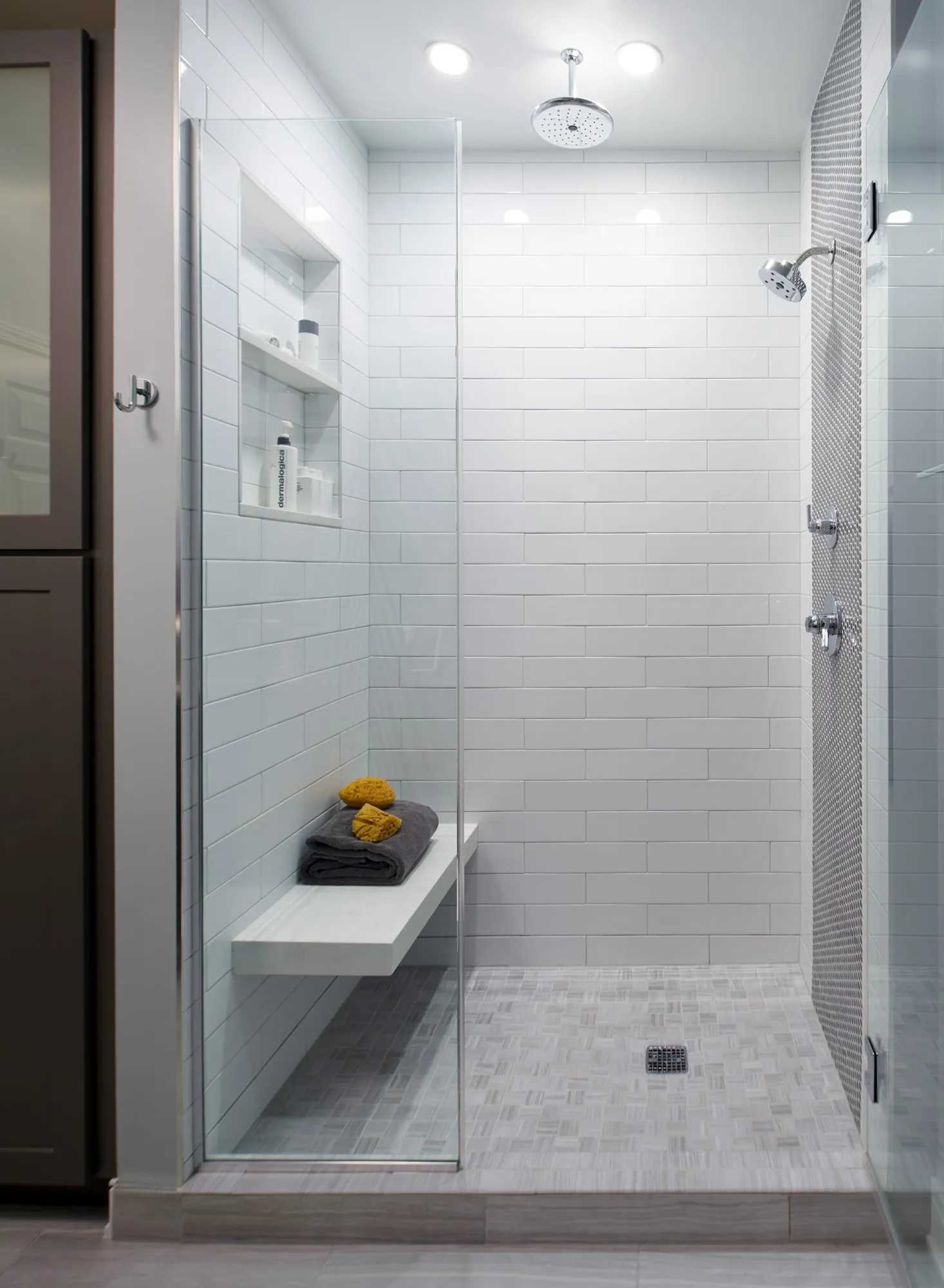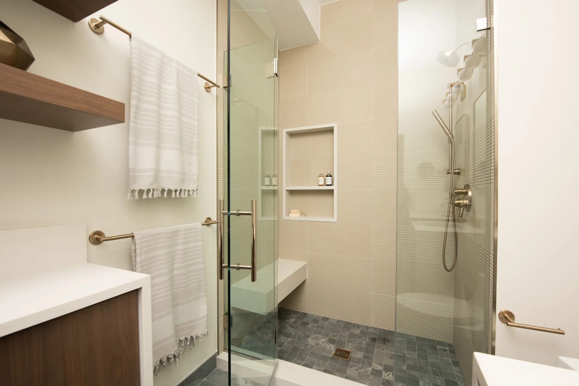 Minimalist primary bathroom showcasing sleek glass shower, integrated shelving, and a floating bench with clean, geometric lines.