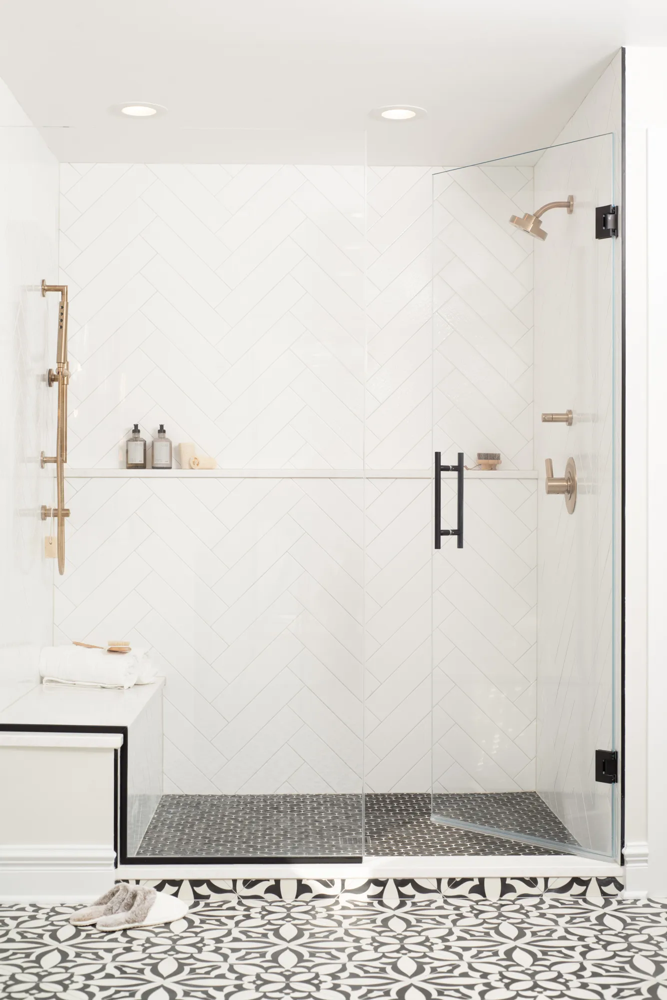 Transitional primary bathroom with glass shower, herringbone tiles, brass fixtures, and patterned floor for a stylish architectural touch.