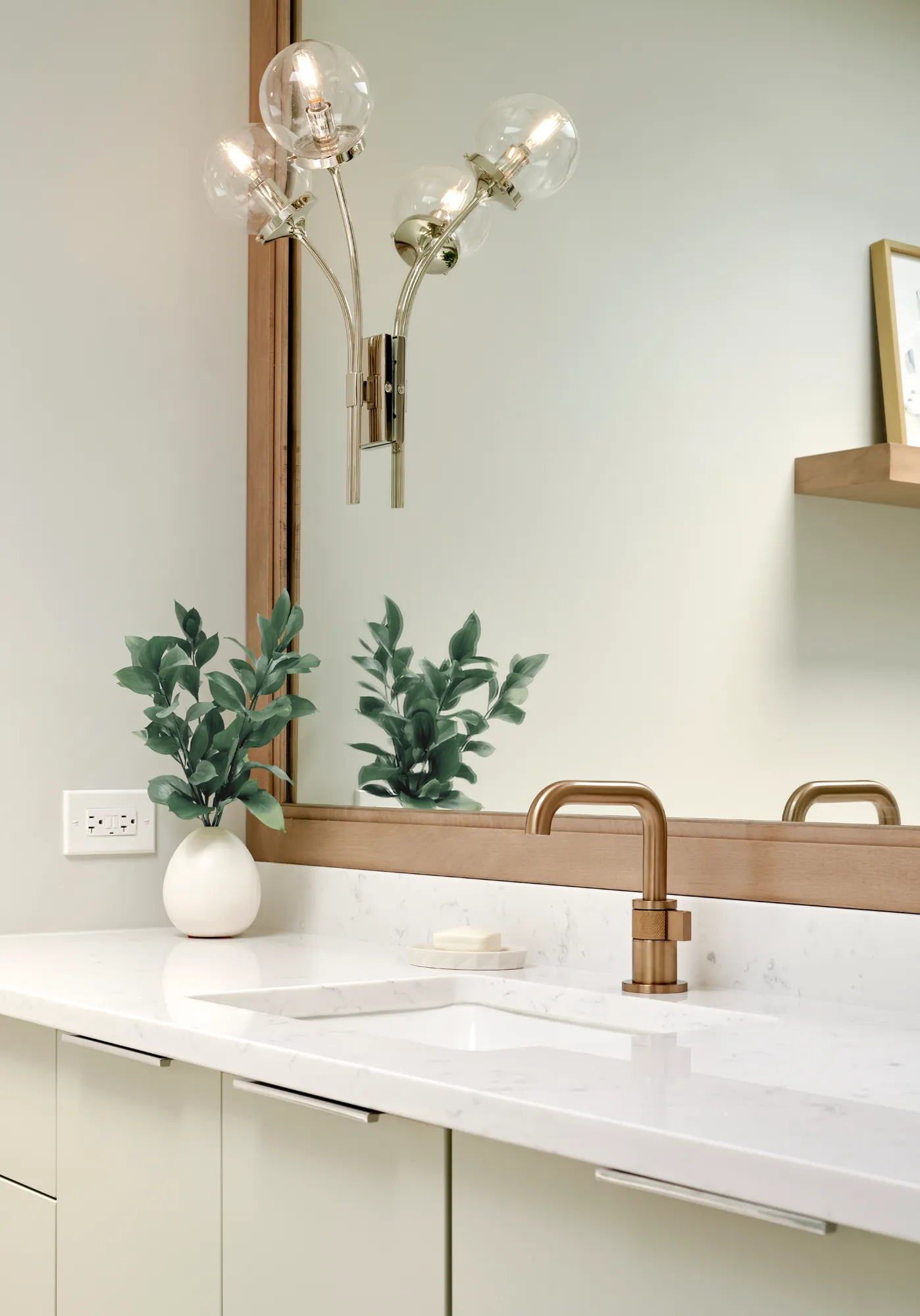 Contemporary primary bathroom with sleek brass fixtures, elegant marble countertop, large wood-framed mirror, and modern globe light accents.