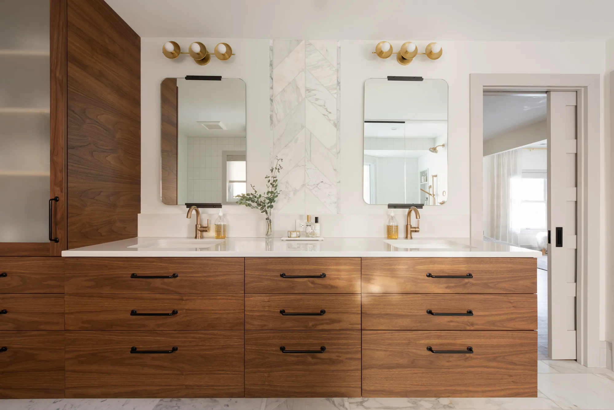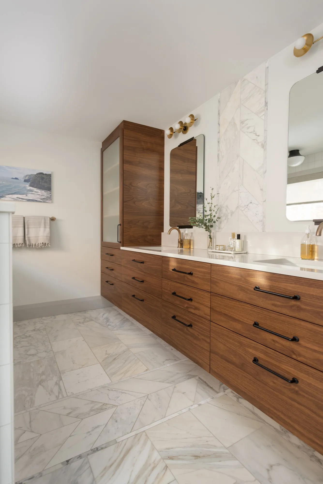 Transitional primary bathroom with marble accent wall, dual mirrors, and rich wood cabinetry. Modern lighting and sleek fixtures enhance the elegant design.