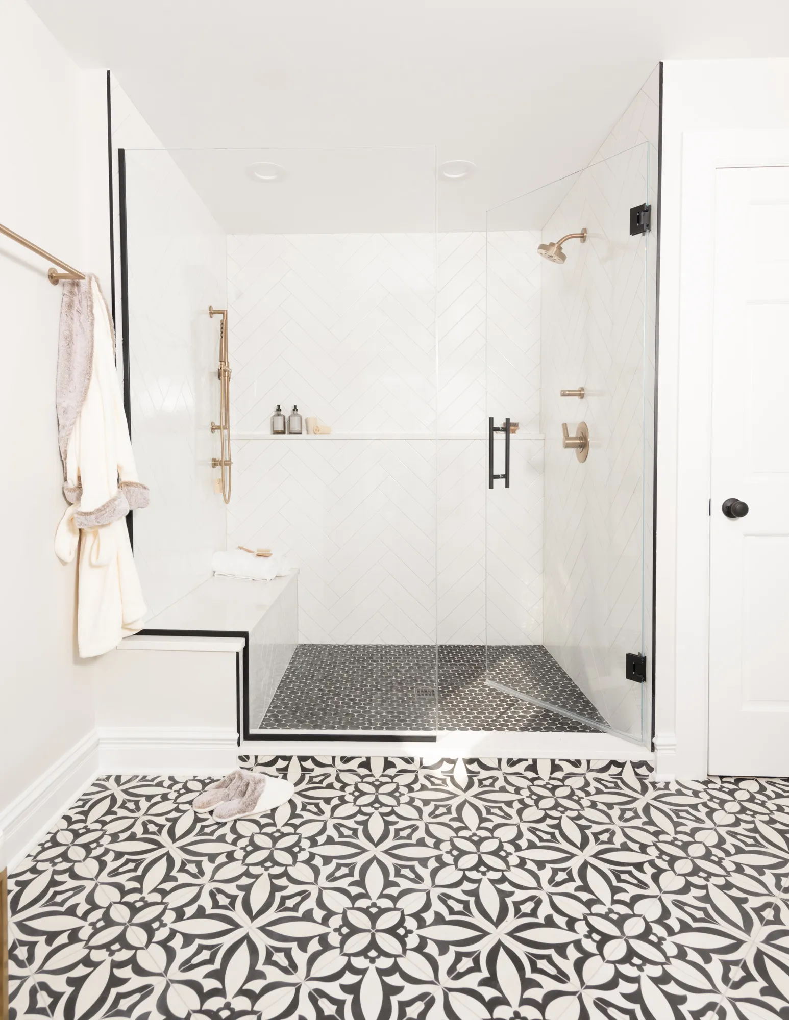 Contemporary primary bathroom showcasing geometric tile flooring, sleek glass shower, elegant black-and-white palette, and stylish brass accents.