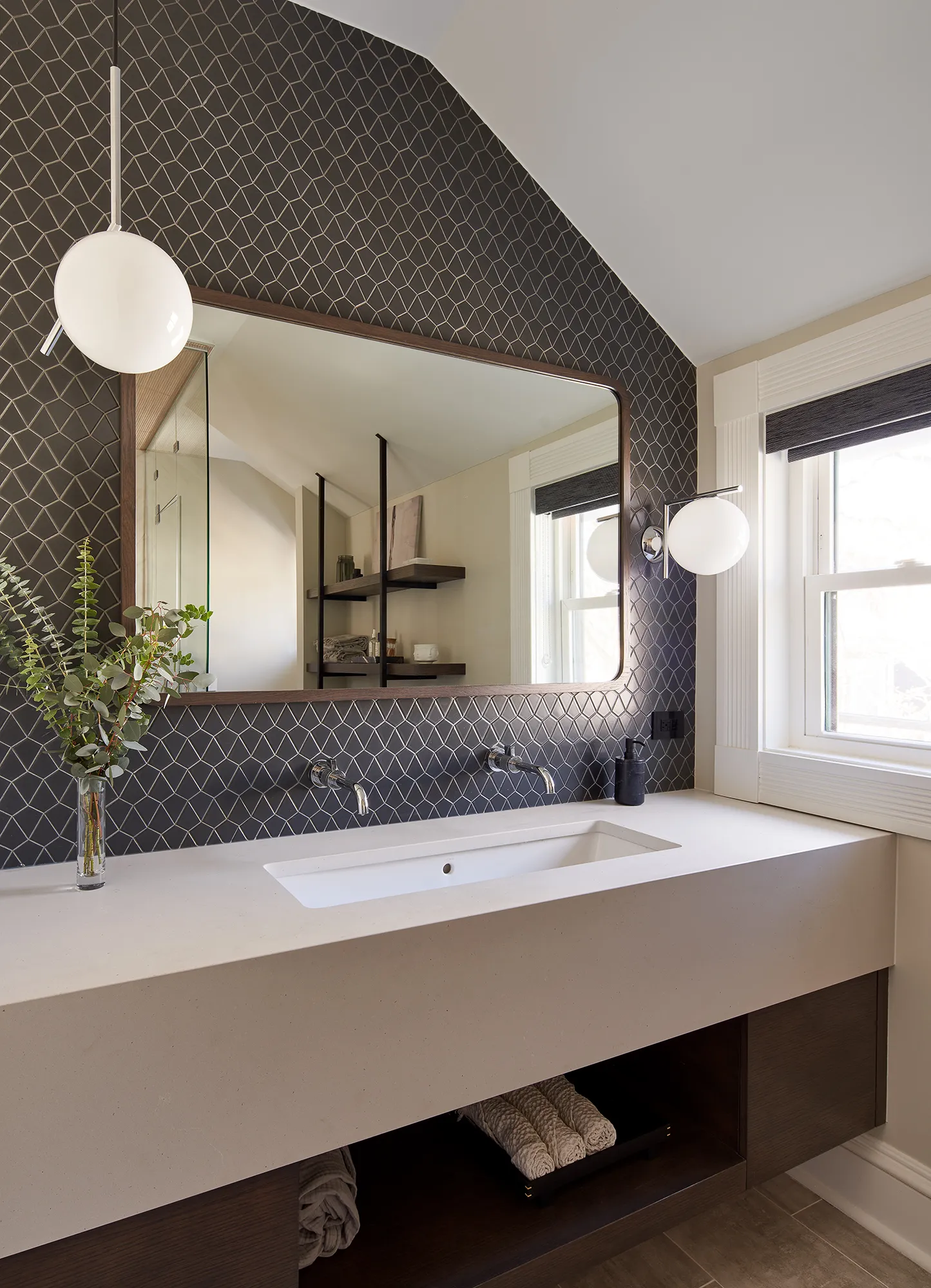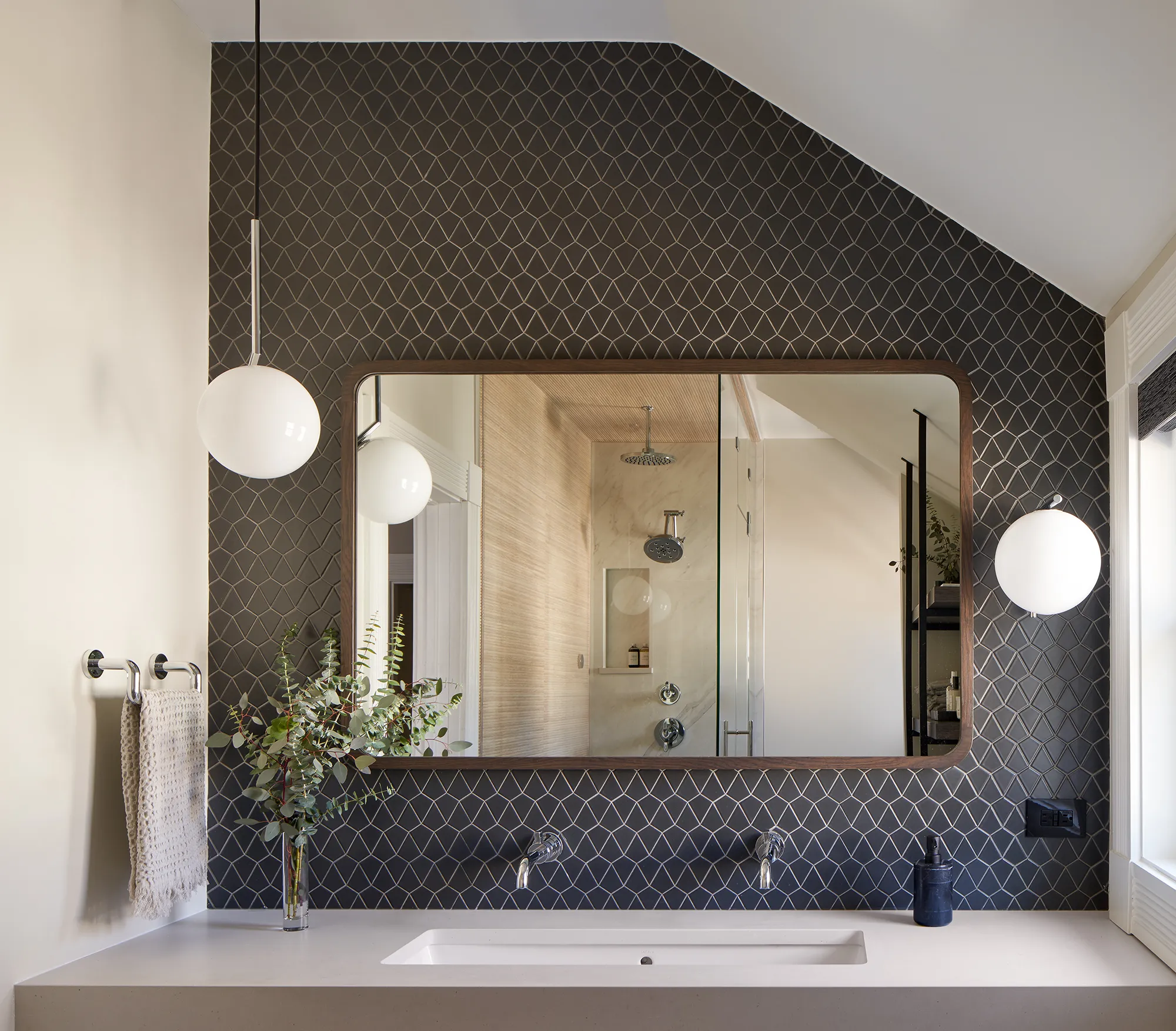 Contemporary primary bathroom with geometric tile wall, sleek floating vanity, and elegant pendant lighting enhancing modern architectural elements.