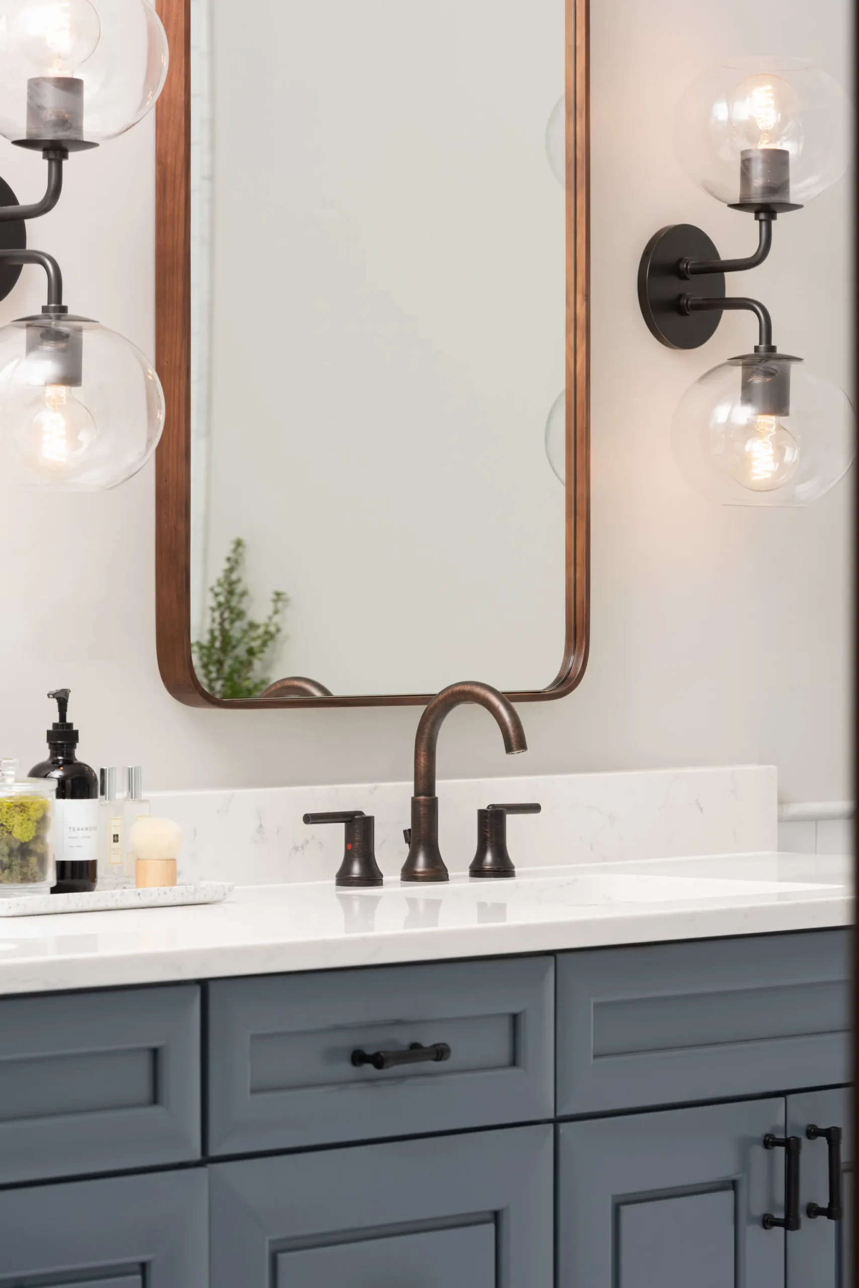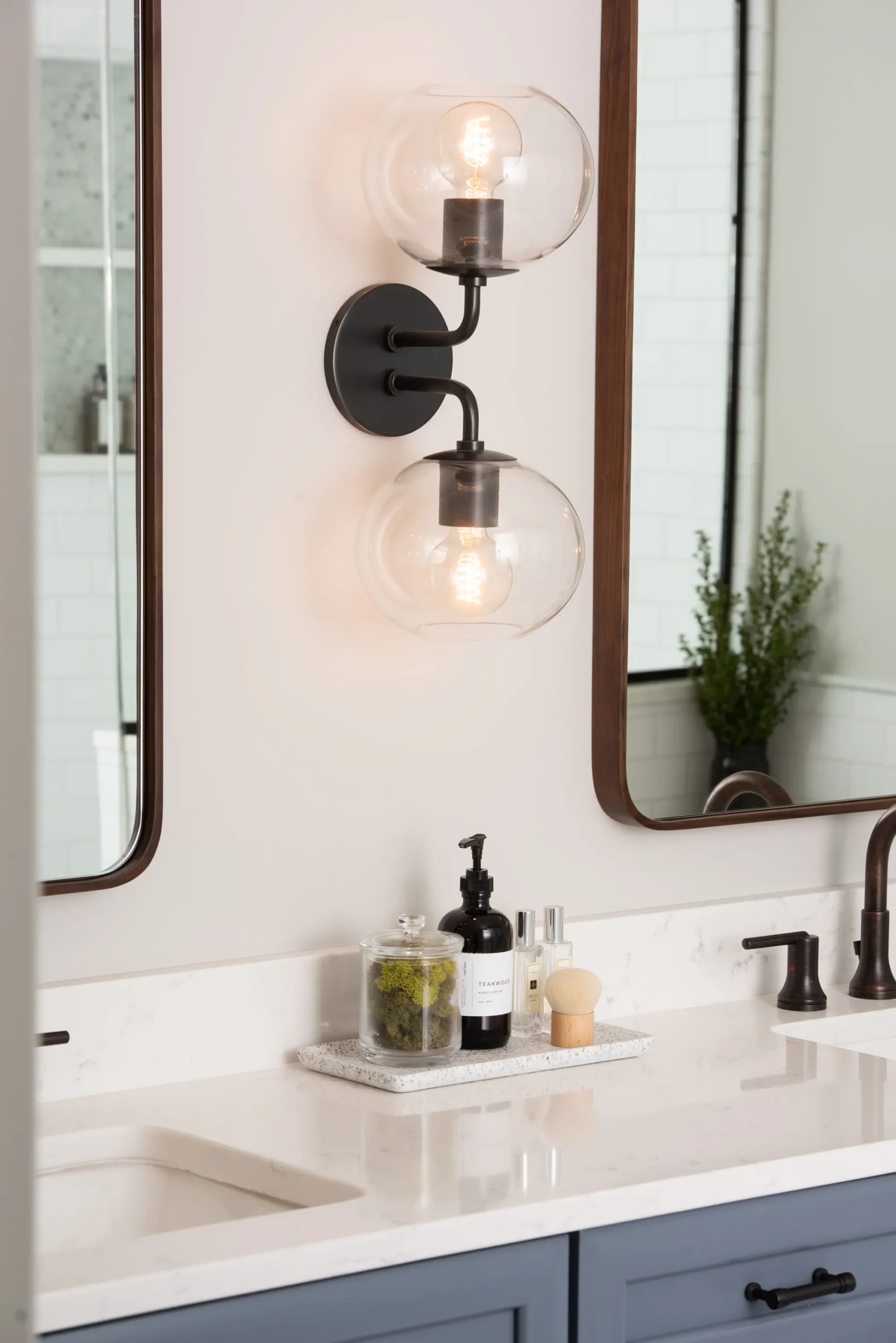 Contemporary primary bathroom with dual globe wall sconce, sleek white marble counter, navy cabinetry, and minimalistic design elements.