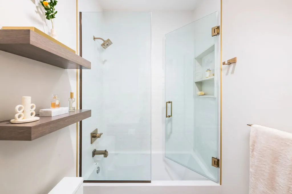 Minimalist guest bathroom with sleek glass shower doors, floating wood shelves, and crisp white walls enhance a serene, modern aesthetic.