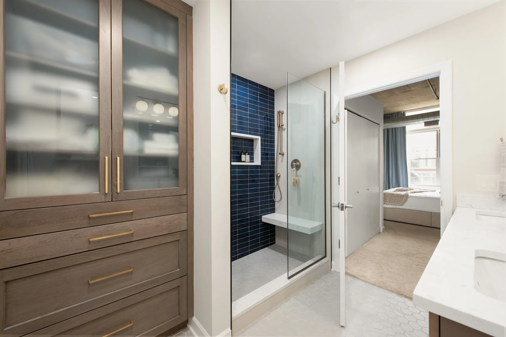 Modern primary bathroom with a sleek glass shower, blue subway tiles, and a wooden vanity. Minimalist design with unique wood accents.