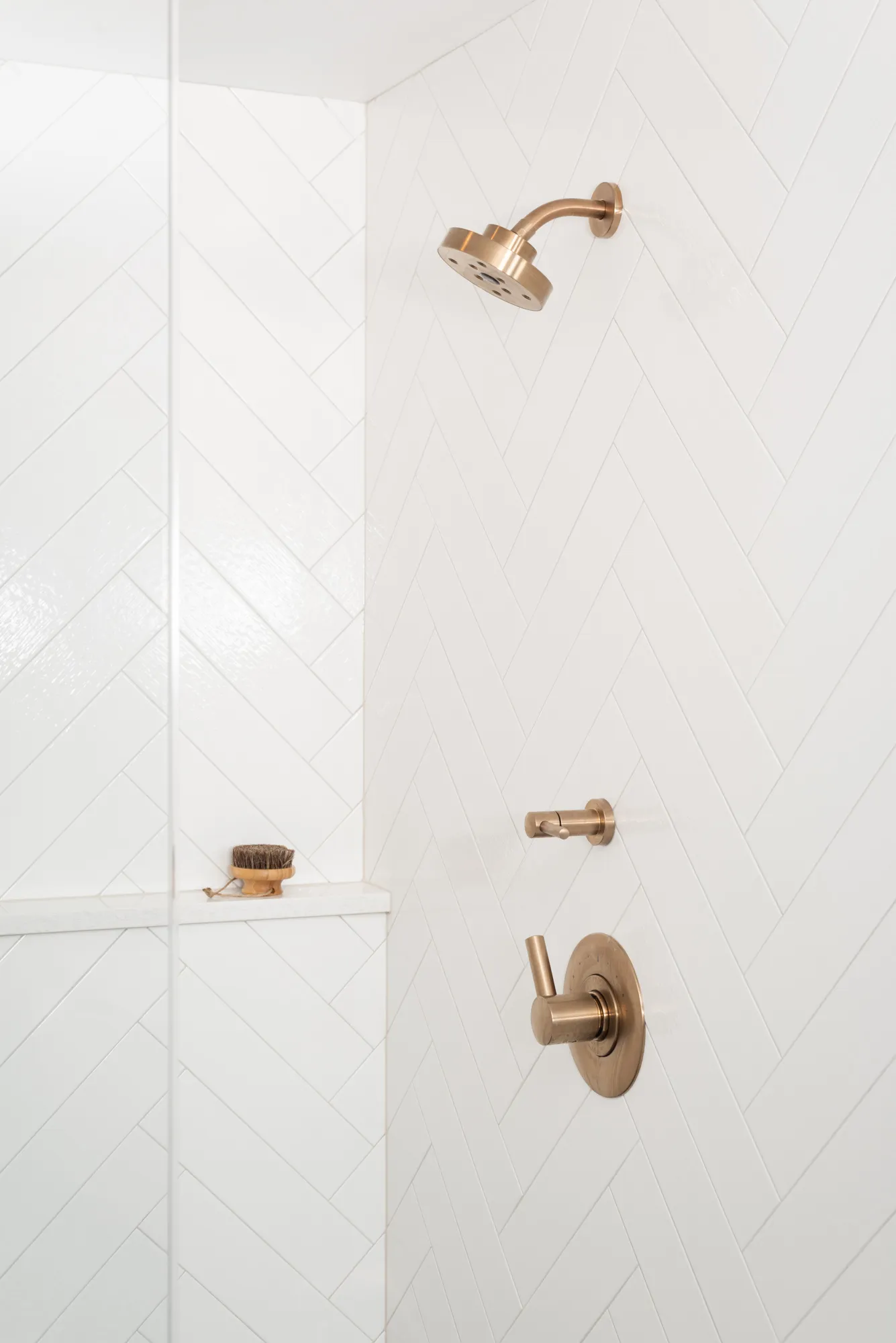Minimalist primary bathroom featuring herringbone tile, sleek glass, and a modern brass showerhead. Contrasting black handle adds a chic touch.