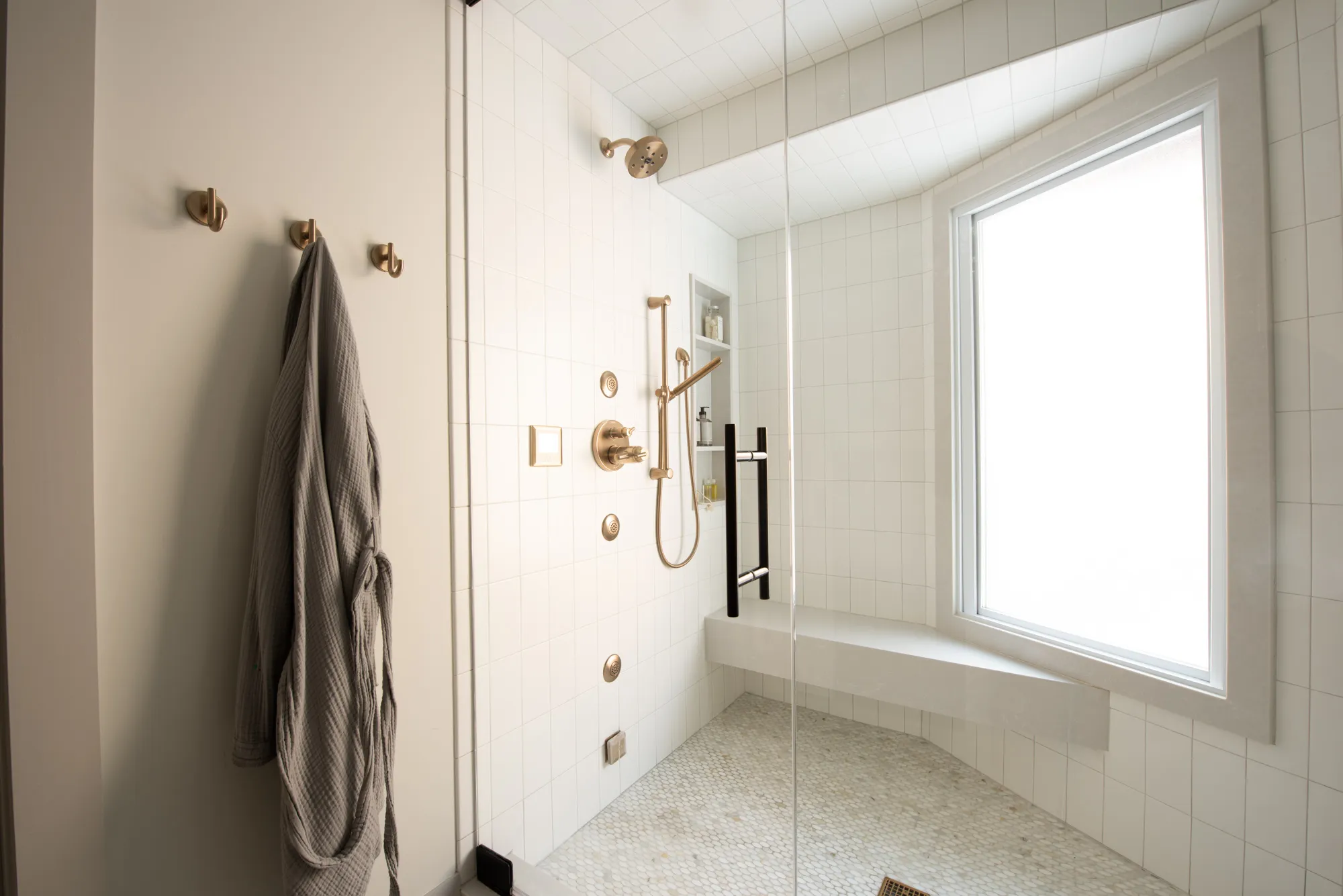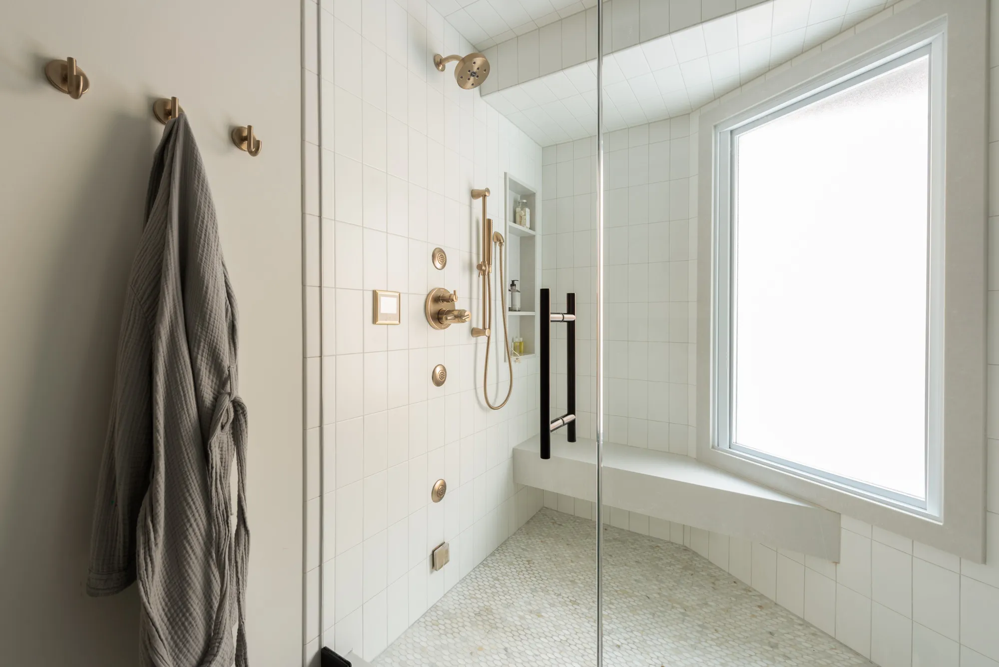 Minimalist primary bathroom with gold fixtures, integrated shelving, and sleek white tiles. Features a modern shower design and natural stone bench.