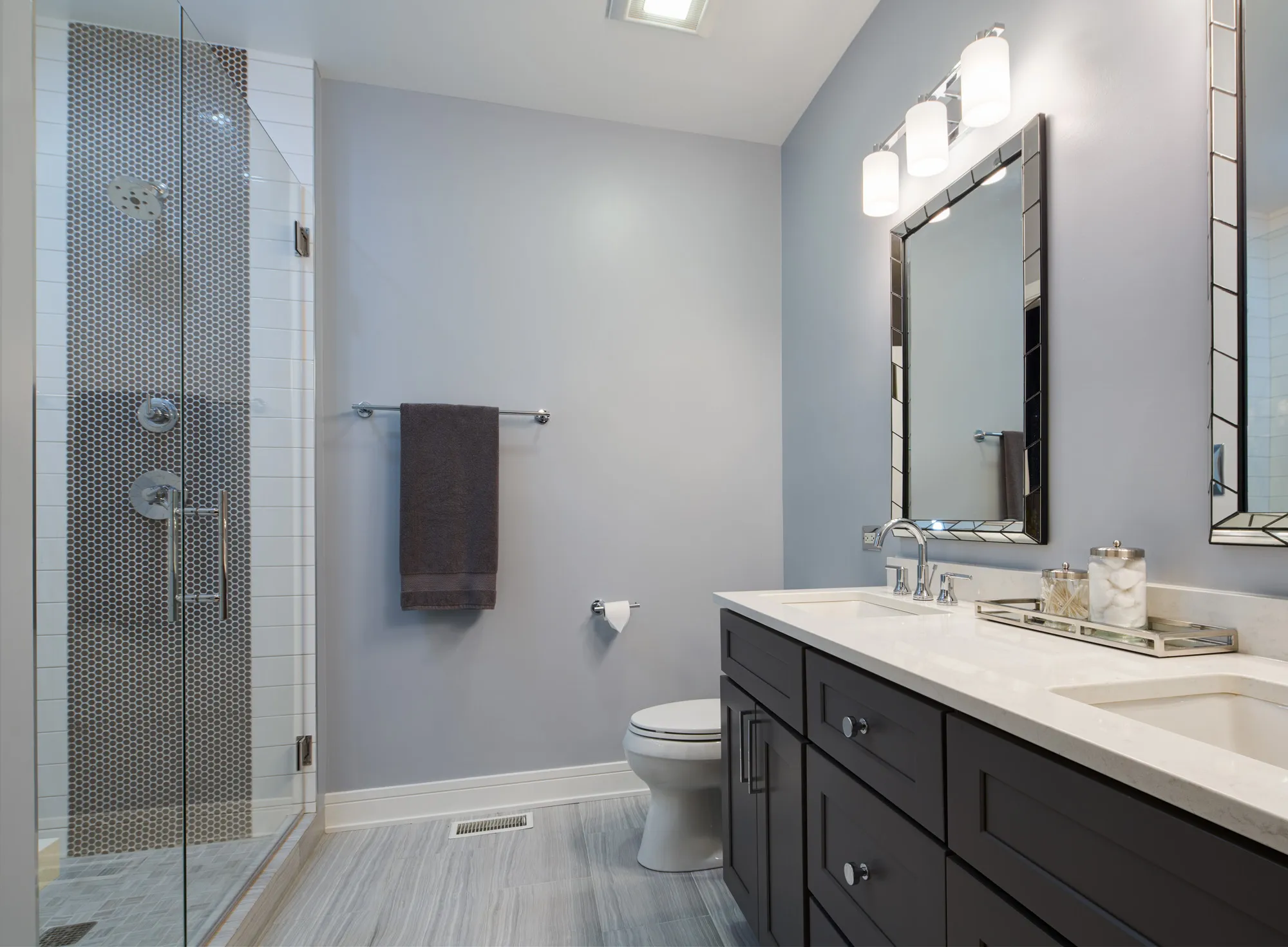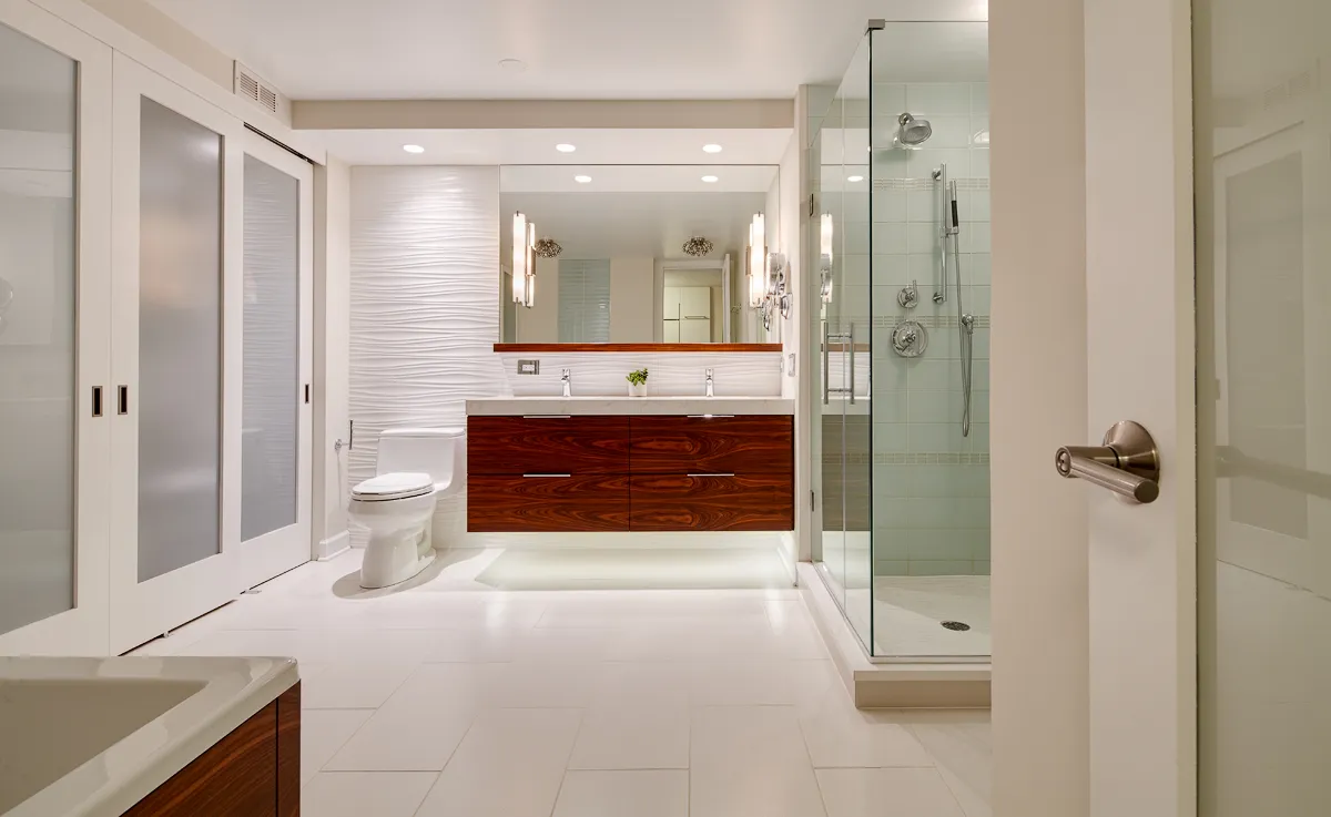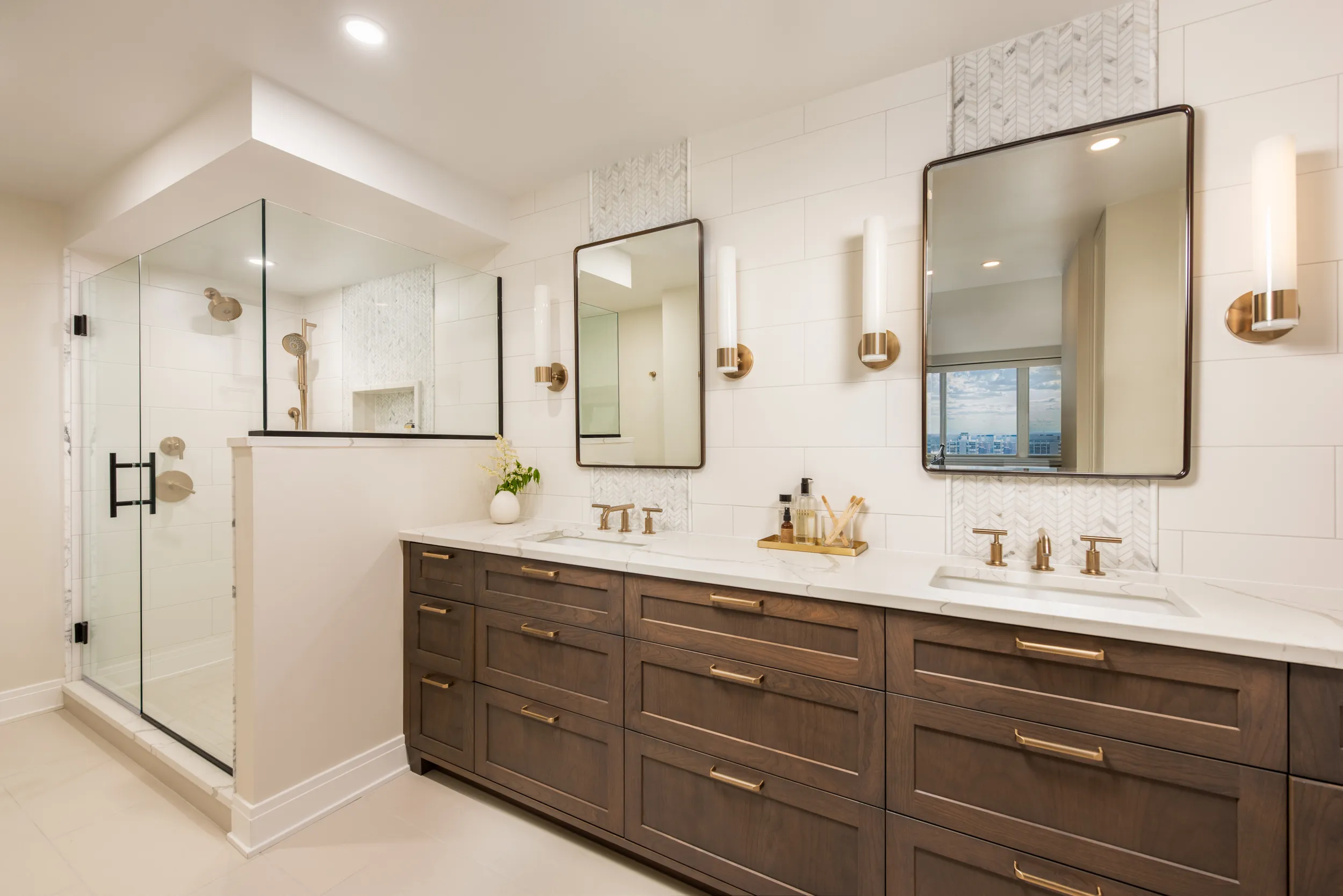 Contemporary primary bathroom with sleek cabinetry, minimalist glass shower, expansive mirrors, and subtle recessed lighting for a sophisticated ambience.