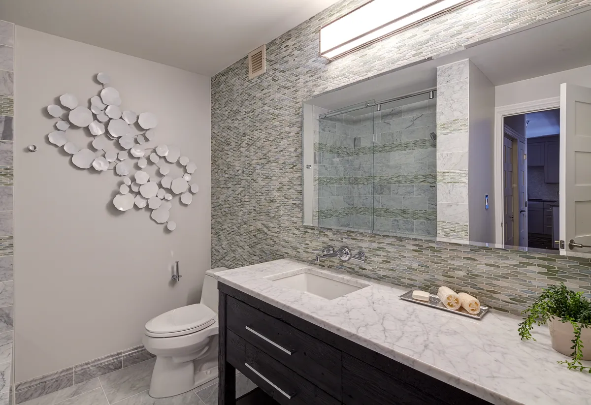 Contemporary bathroom with marble countertop, mosaic tiled wall, floating vanity, frameless glass shower, and artistic wall decor.