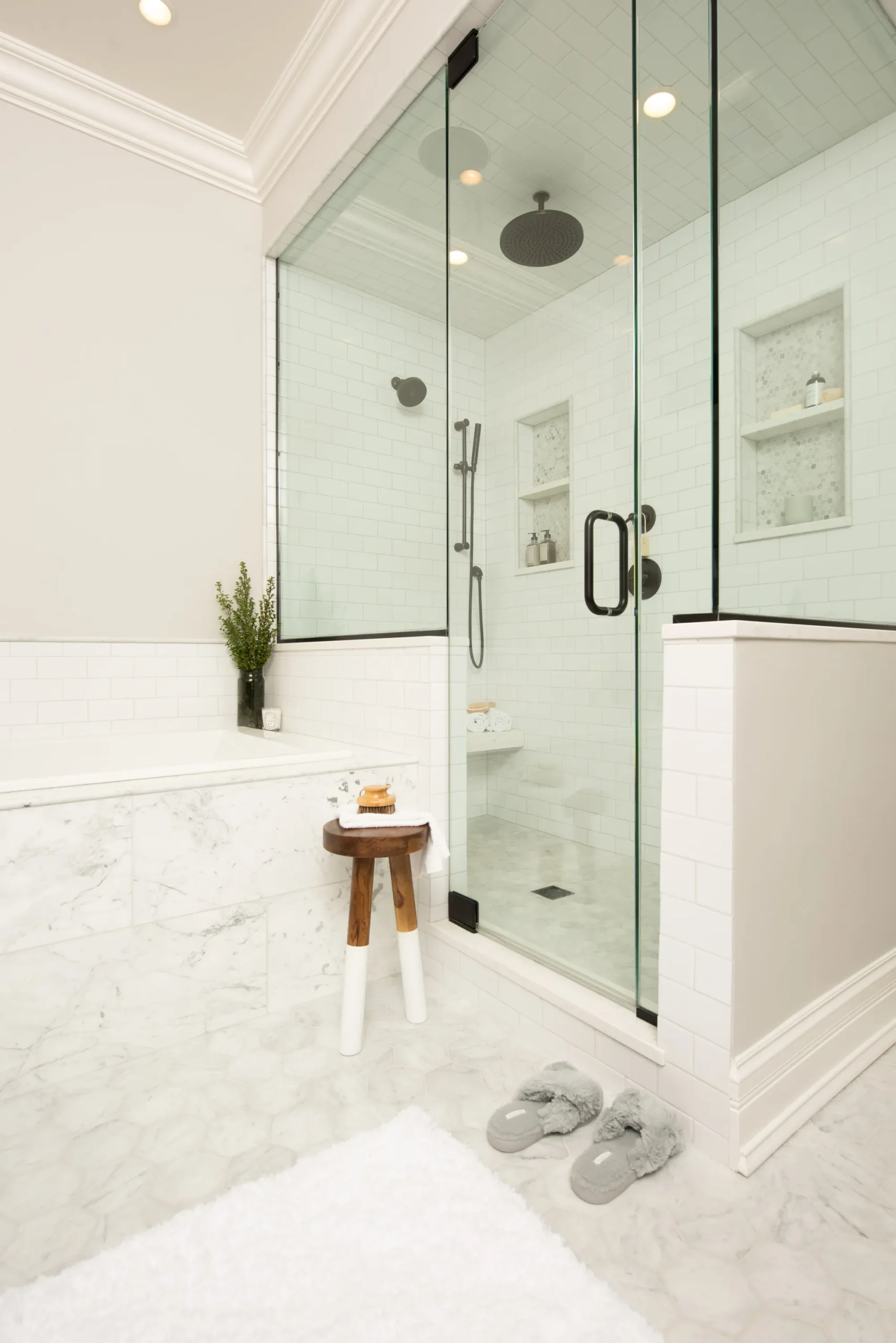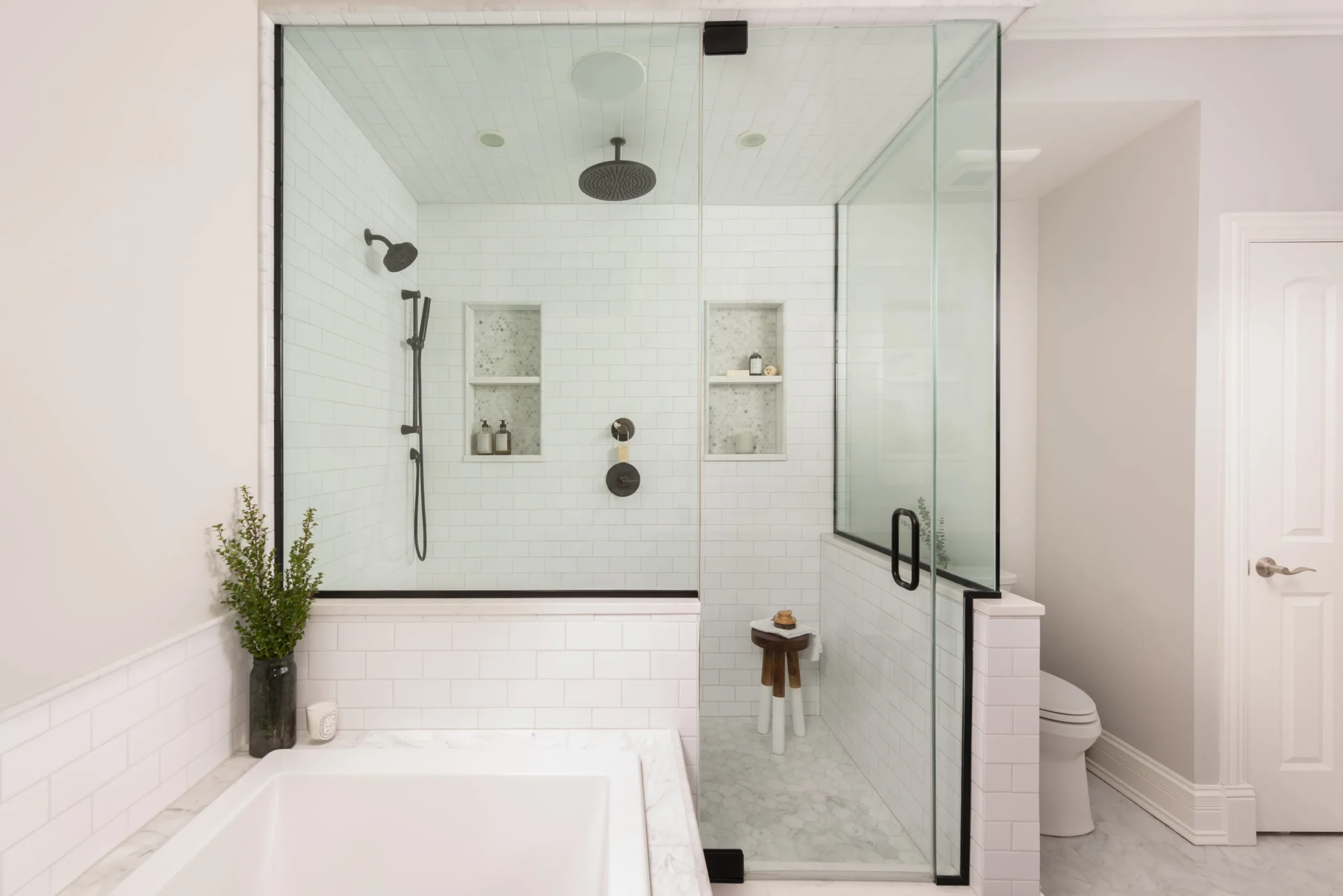 Contemporary primary bathroom with a sleek glass shower, minimalist fixtures, recessed shelving, and a luxurious tub, featuring elegant white tilework.