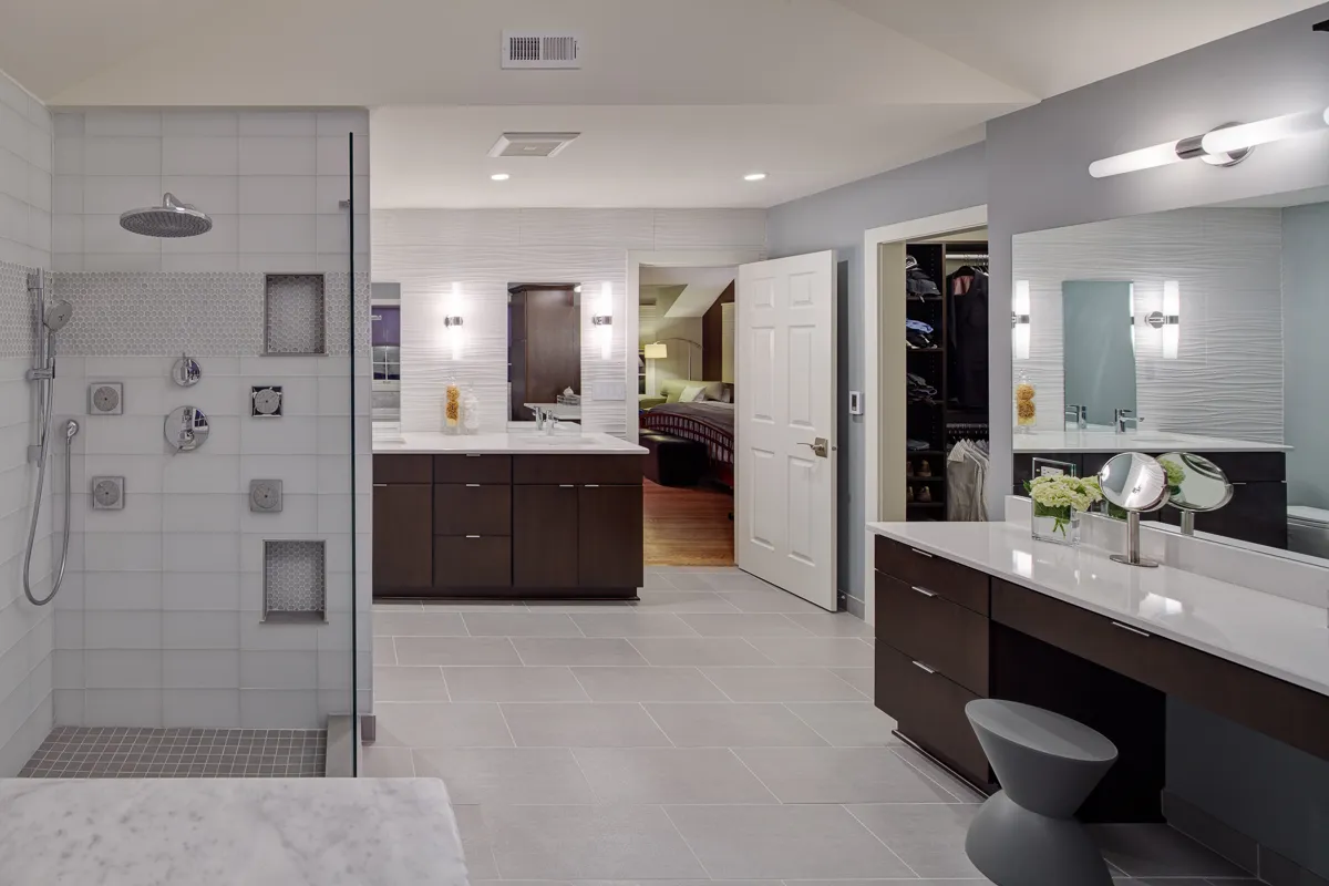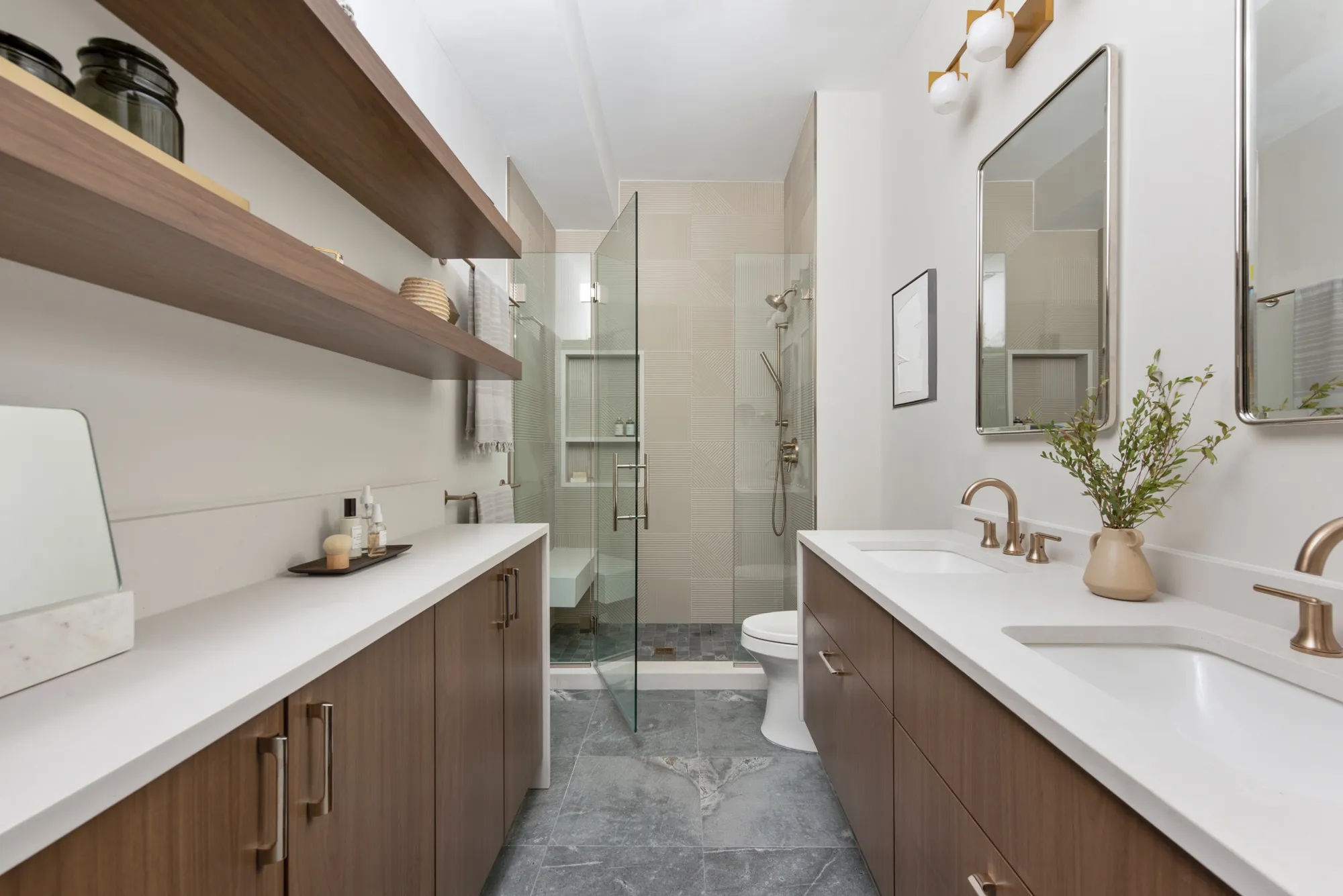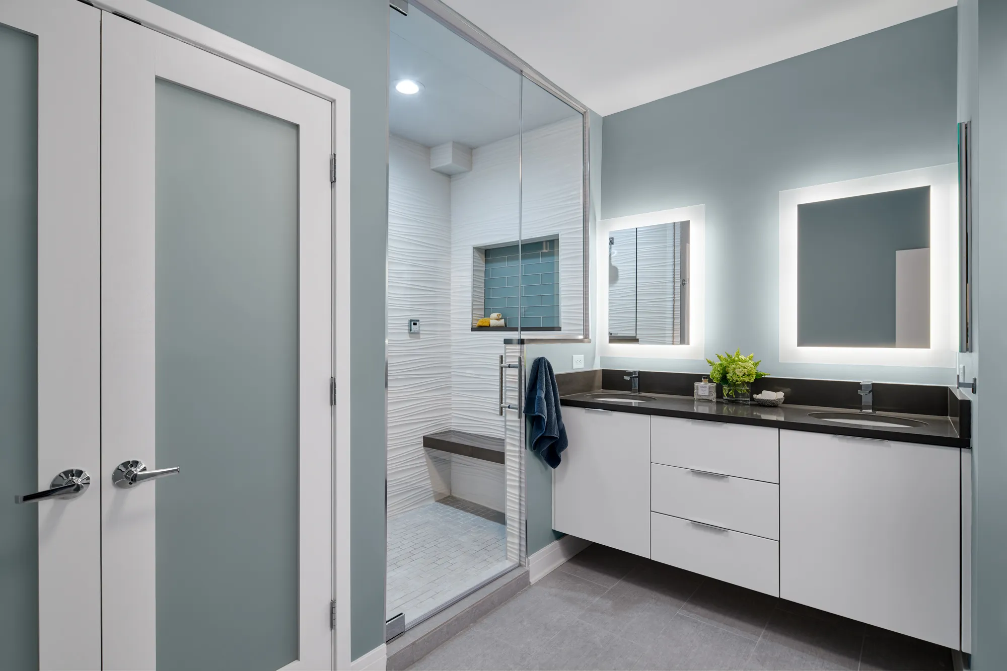 Contemporary primary bathroom with sleek double vanities, LED-lit mirrors, minimalist cabinetry, and a glass-enclosed shower showcasing modern design.