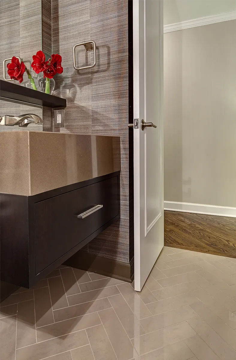 Contemporary bathroom with floating vanity, textured walls, sleek faucet, and herringbone tile flooring. Bold red flowers add a touch of vibrancy.