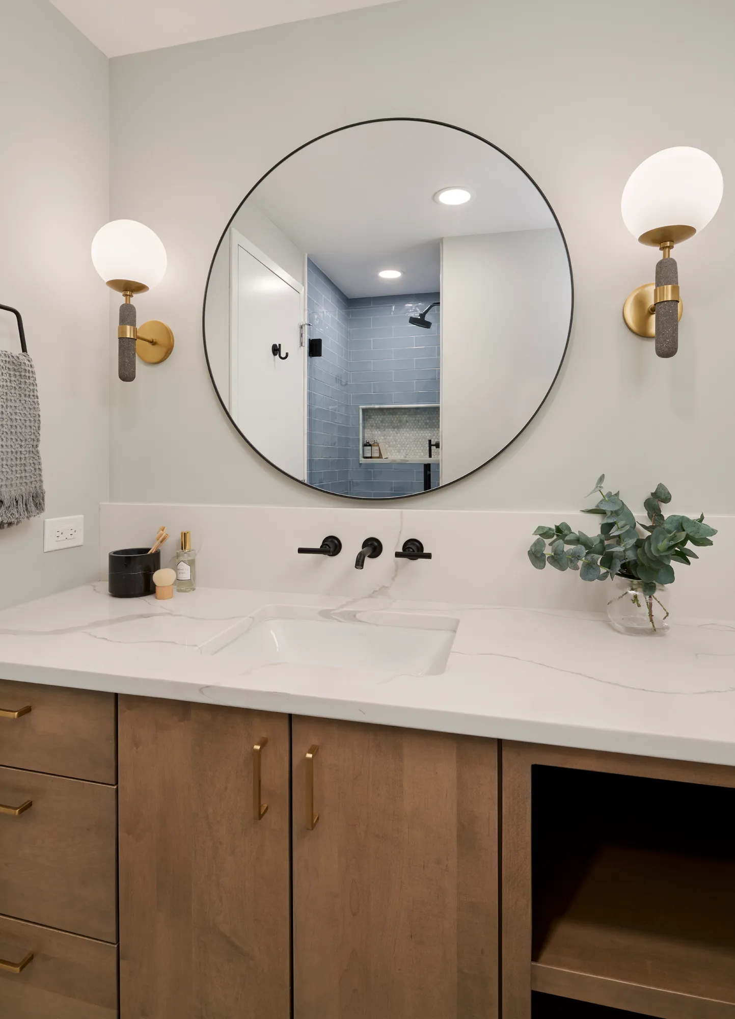 Contemporary guest bathroom with round mirror, sleek wall sconces, minimalist faucet, wooden vanity, and smooth quartz countertop. Elegant and functional design.