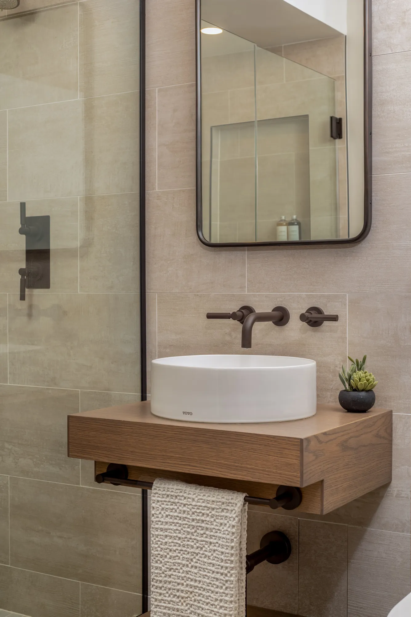 Minimalist guest bathroom with modern vessel sink, sleek wall-mounted faucet, floating wooden vanity, elegant mirror, and neutral toned tiles.