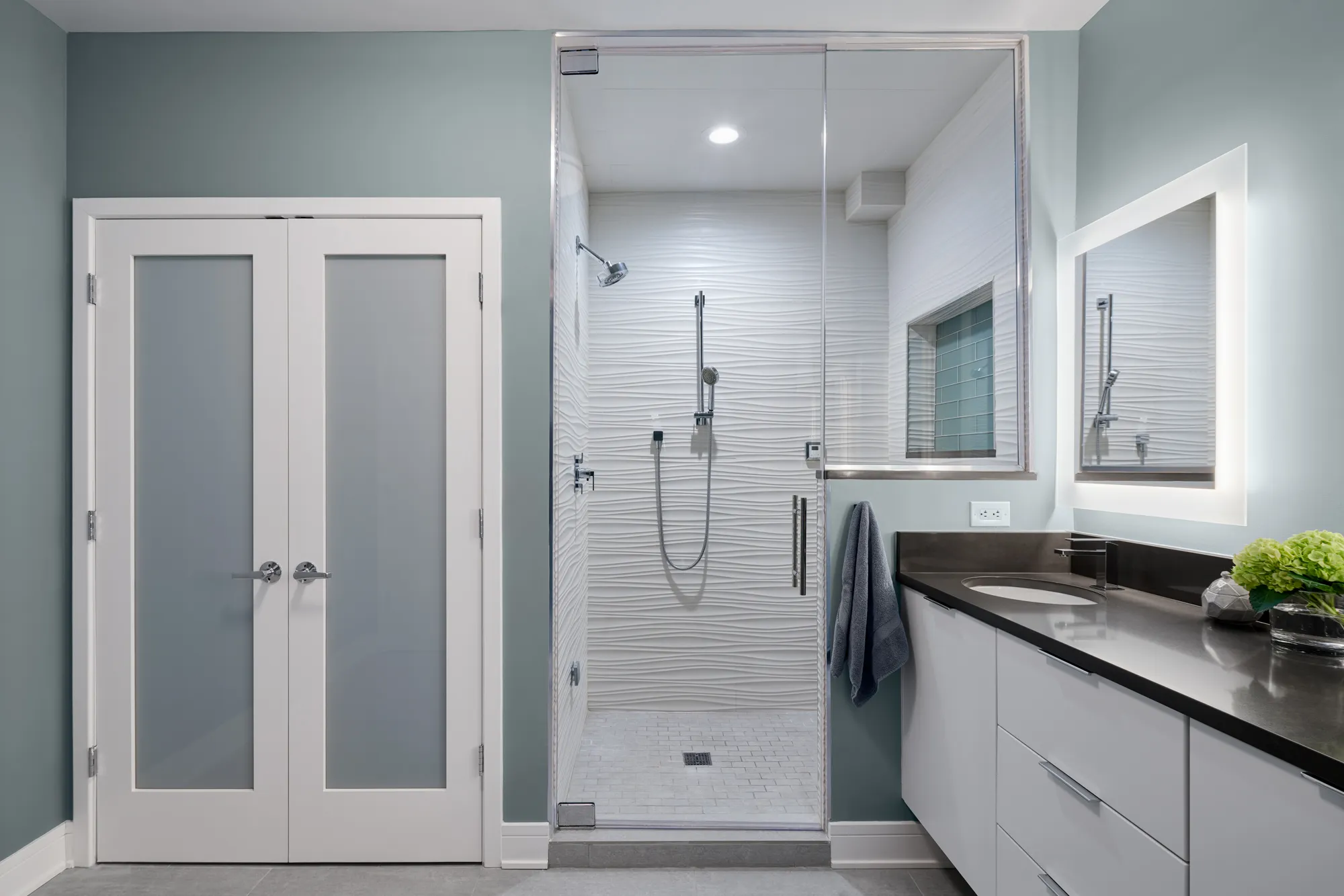 Contemporary primary bathroom showcasing sleek glass shower, dual sinks, modern lighting, textured wall tiles, and elegant double doors.